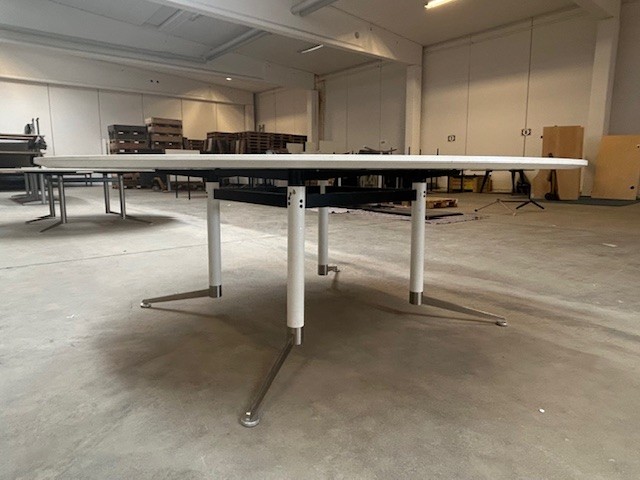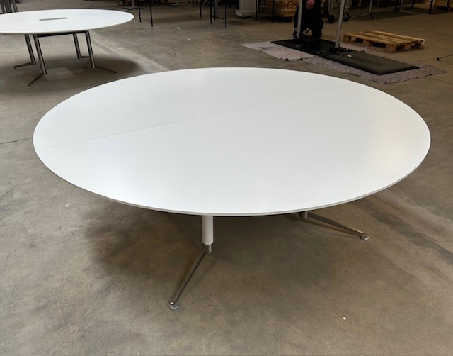 "Stort rundt Paustian Spinal konferencebord med todelt bordplade i hvid laminat og hvidt stel med fødder i børstet stål med stilleskruer, for en øget stabilitet.