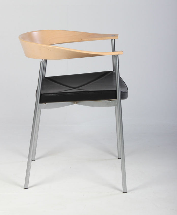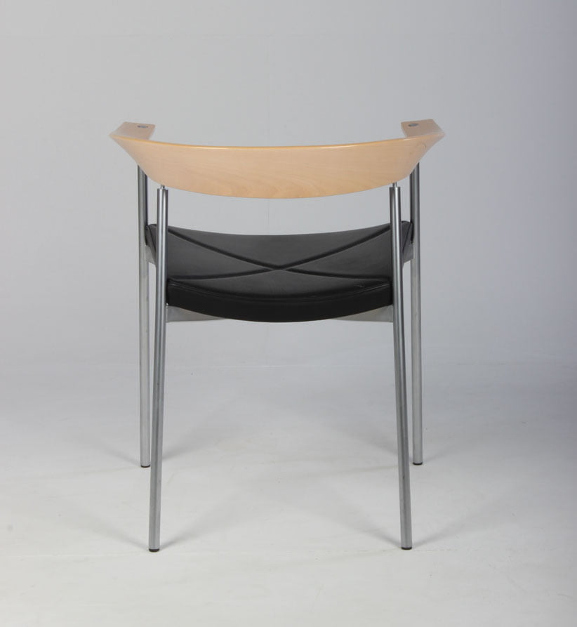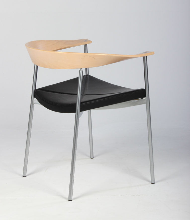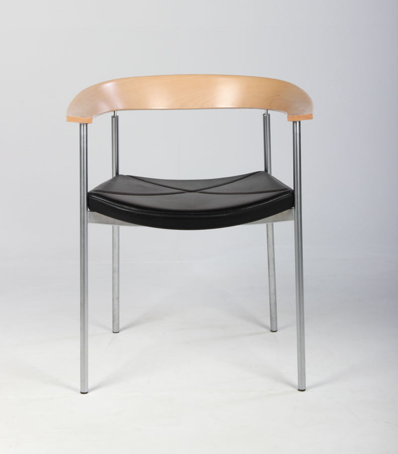 "Paustian Stuk konferencestol med kraftigt polstret sort lædersæde, ryg og armlæn i lys bøg og stel i børstet stål.