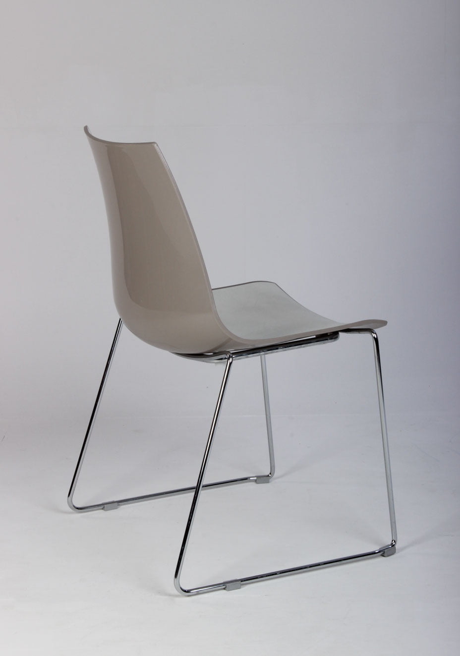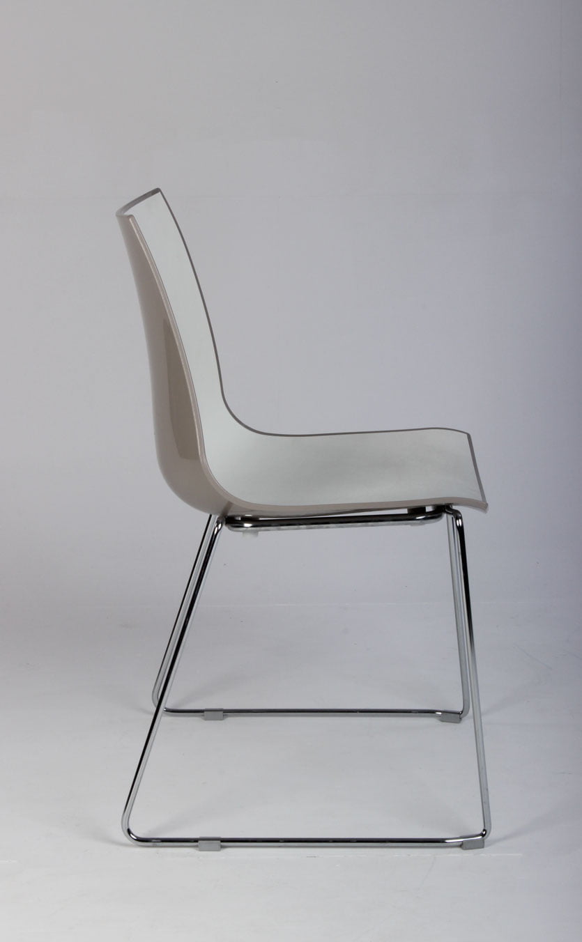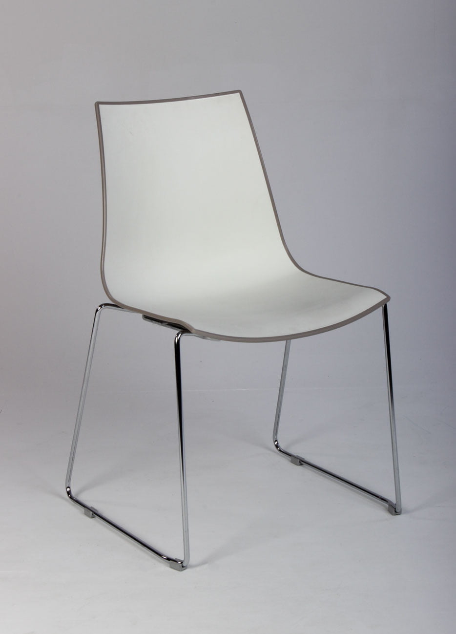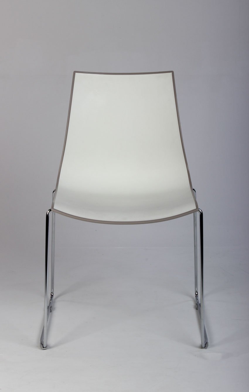 Kantinestol, med hvid front og blank, mocca-farvet bagside.