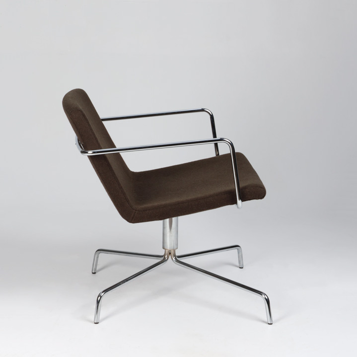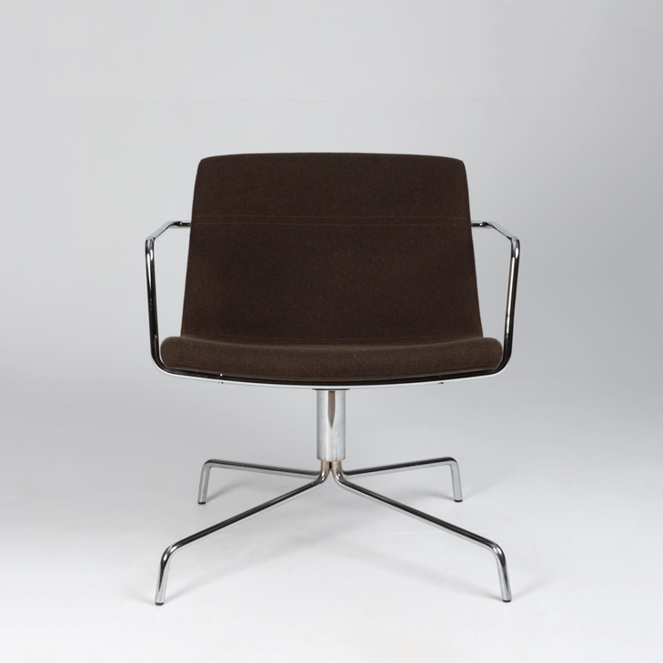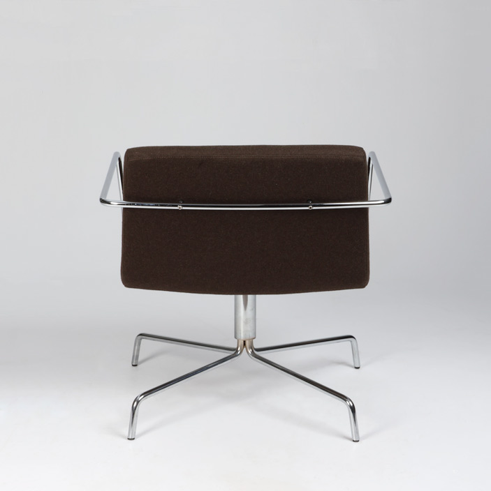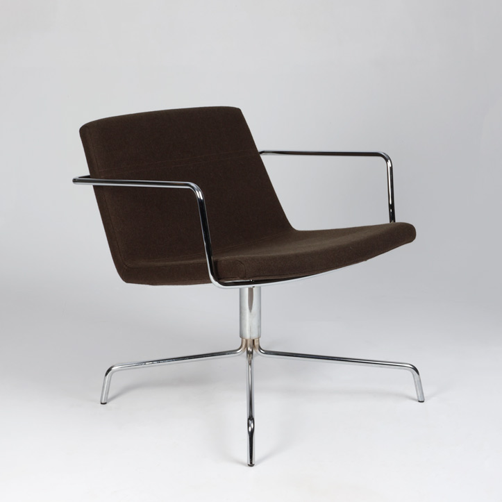 "Piioroinen Flakes loungestol fuldpolstret i ryg og sæde med brun børstet uld og blankforkromet drejestel. Stolen har endvidere en fleksibilitet i sædet, for en mindre fastlåst og mere behagelig siddeposition.