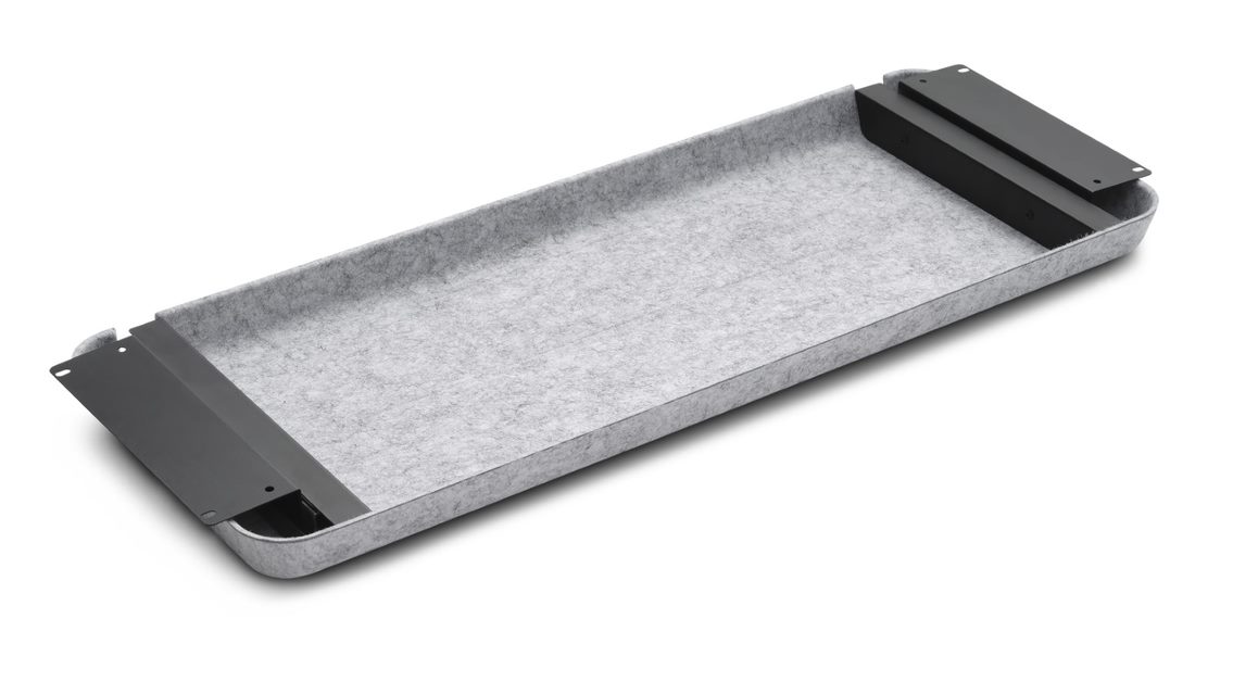 "APTO Slim filtbetrukket bred udtræksskuffe i lys grå, til montering under bordpladen på skrive- eller hæve-sænkebordet. Skuffen er perfekt til opbevaring af post-its, kuglepenne A4 papirer og øvrige mindre kontorartikler. Tilkøb evt. en lille indsats til kuglepenne og lignende, så mindre og større kontorartikler kan opdeles. Skuffen er designet med omtanke for naturen – filten er fremstillet af 70% plastflasker fra havene.