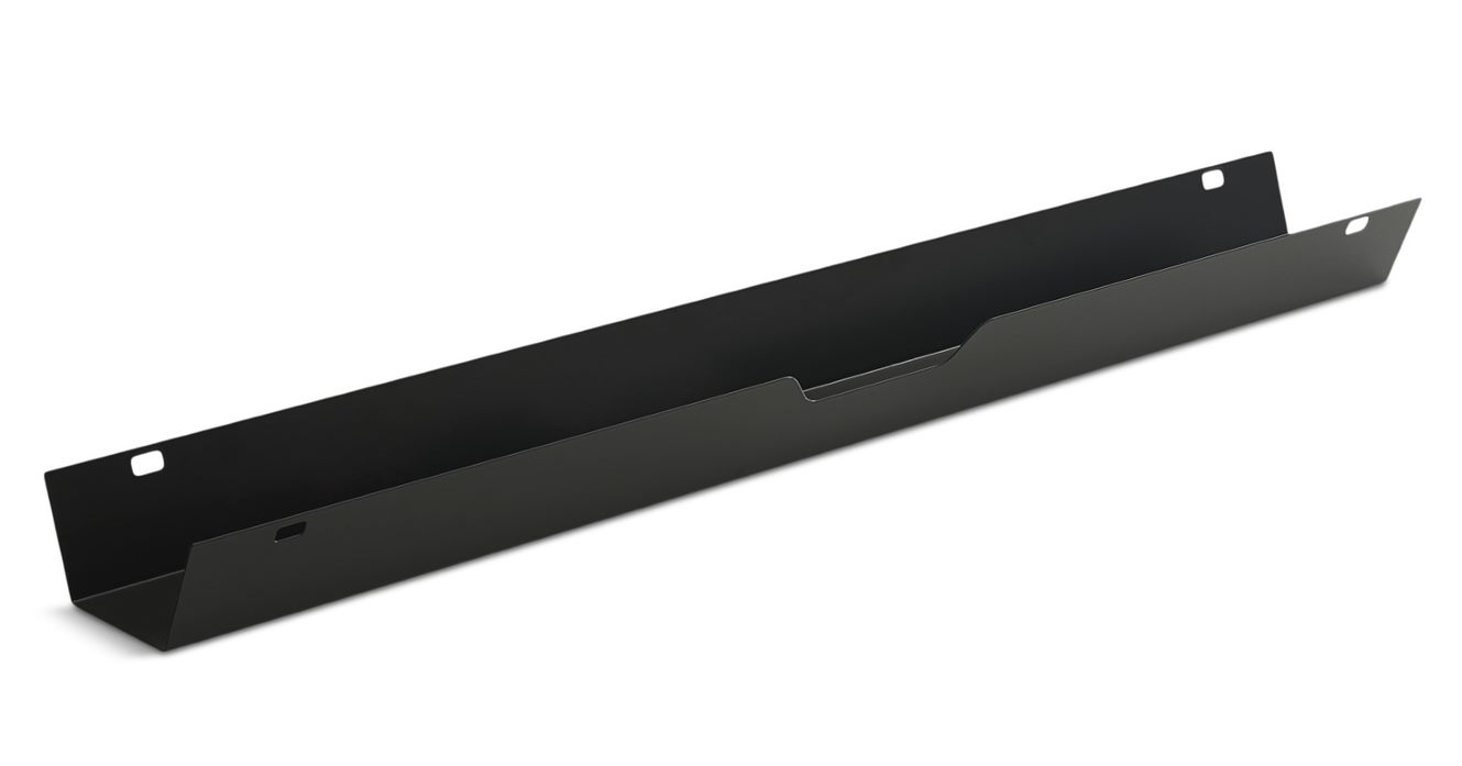 "APTO PLUS Gaia kabelbakke på 115 cm i sort (RAL9005). Med en kabelbakke monteret under hæve sænkebordet, er det nemt at holde styr på ledninger og kabler fra computer, skærme osv. Når de ligger beskyttet og samlet under bordpladen, undgår man fejlagtigt at trække dem ud, samt gulvet holdes ryddeligt og pænt herunder.