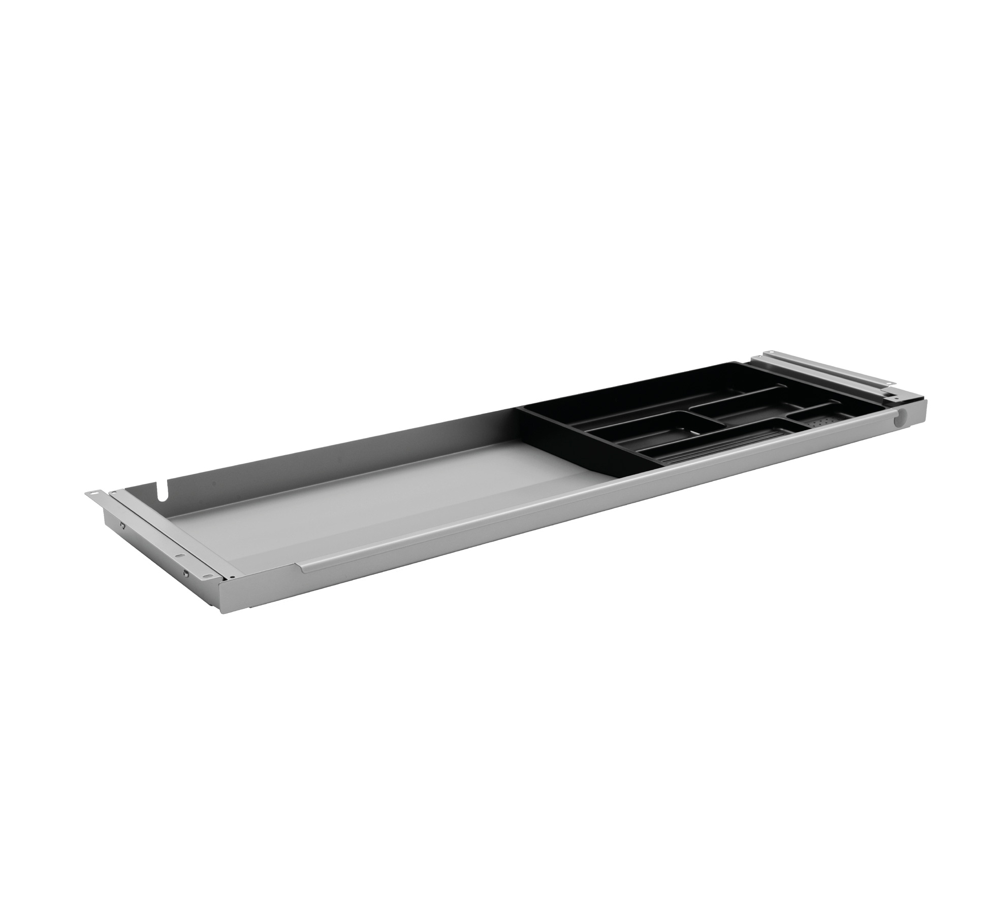 "APTO PLUS Slimtray Large rekvisitskuffe i grå (RAL 9006) – et pænt og diskret alternativ til den traditionelle skuffekassette på hjul. Dette er en større variant af udtræksskuffer der monteres under bordpladen, så den på elegant vis, flugter med bordkanten. Skuffen har udtagelig pennebakke til mindre kontorartikler, samt plads til en laptop eller docking system, så dette ikke optager plads på arbejdsbordet.