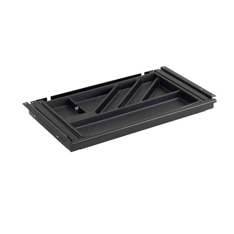 "APTO PLUS Slimtray Small rekvisitskuffe i sort metal (RAL 9005) – et pænt og diskret alternativ til penneholderen på skrivebordet. Som navnet angiver, er denne variant en lille udtræksskuffe der har plads til kuglepenne, post-its mv., og monteres med 4 skruer under bordpladen, så den på elegant vis, flugter med bordkanten. Skuffen har udtagelig pennebakke og et lille aflangt greb, der gør den nem at åbne.