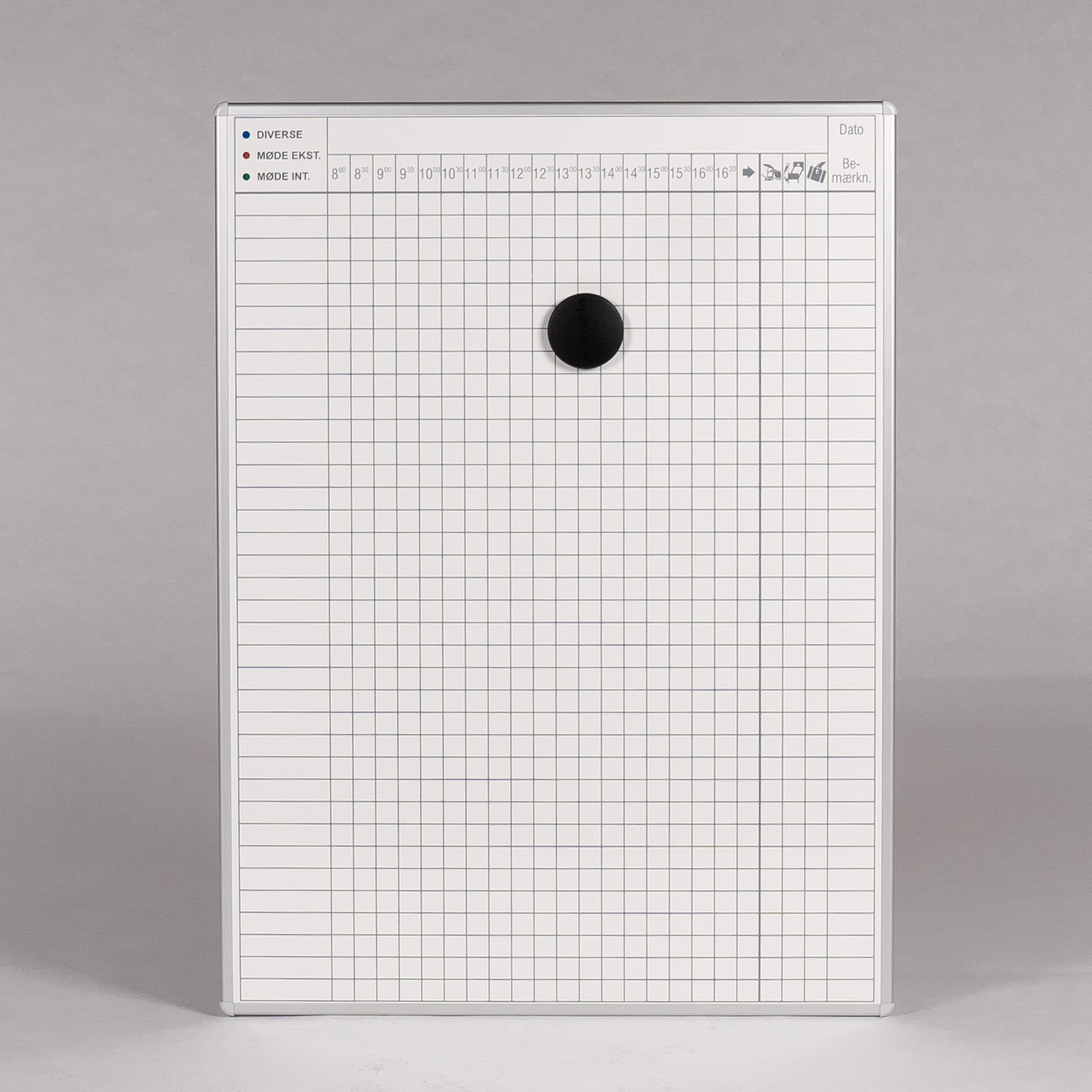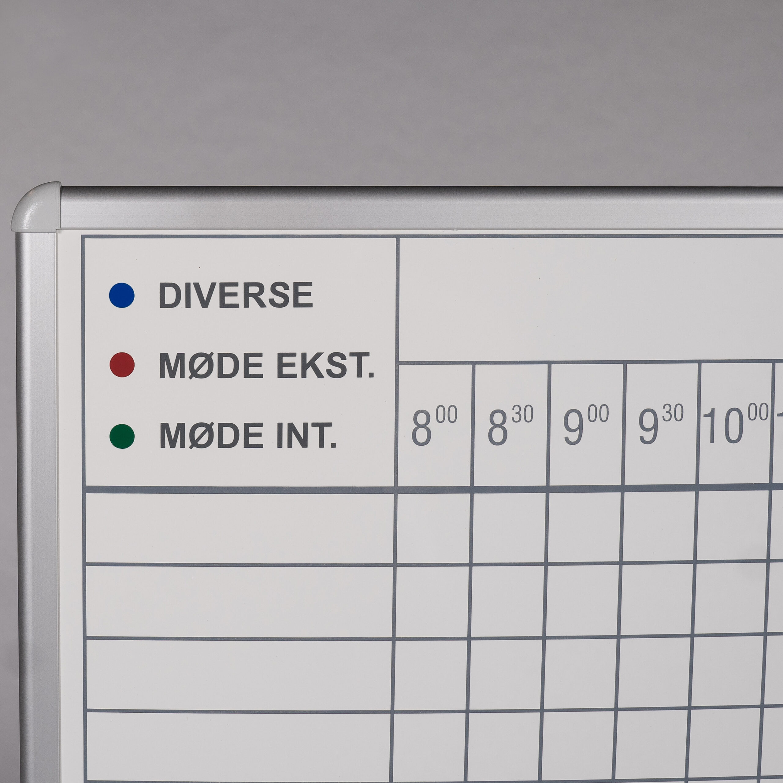 "Borks whiteboards planlægningstavle med dato og klokkeslet.