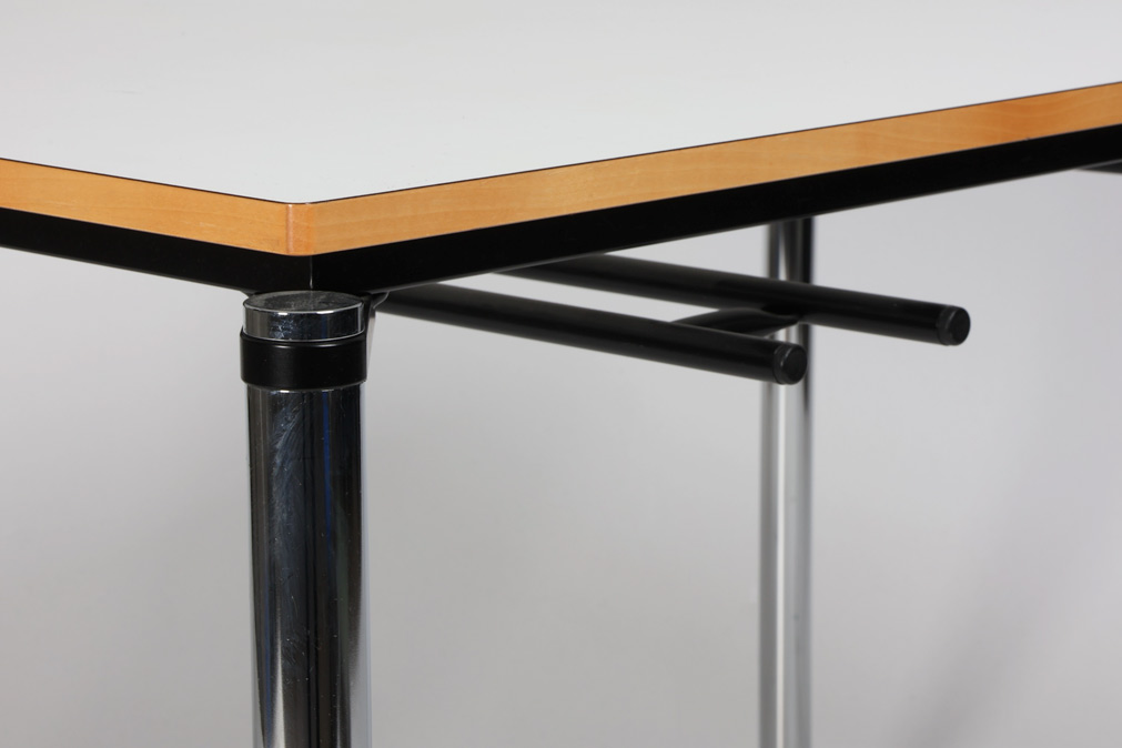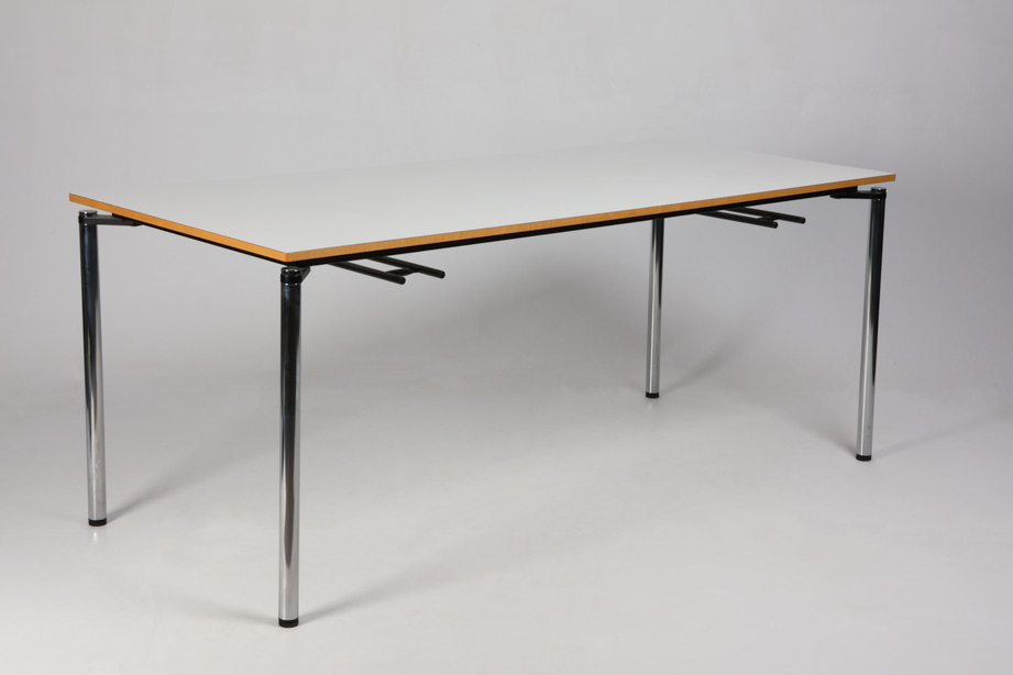 "Randers+Radius Rail kantinebord i hvid laminat med lakeret trækant og blankforkromet stel. Bordet har i alt 4 ophængsbeslag monteret samt stilleskruer under to ben.