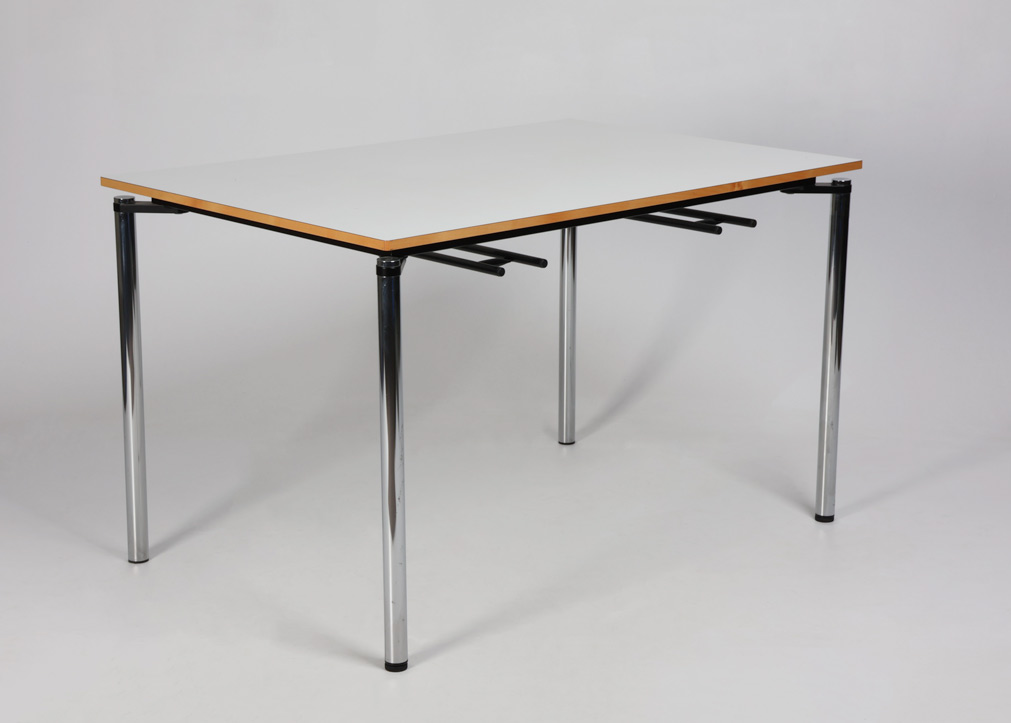 "Randers+Radius Rail kantinebord i hvid laminat med lakeret trækant og blankforkromet stel. Bordet har i alt 4 ophængsbeslag monteret samt stilleskruer under to ben.