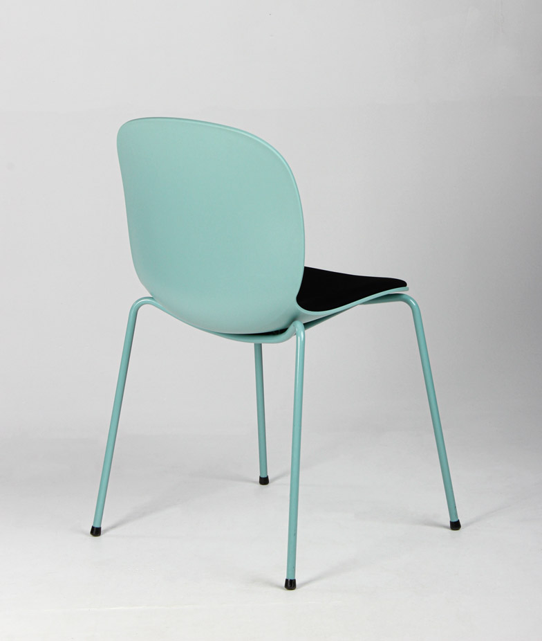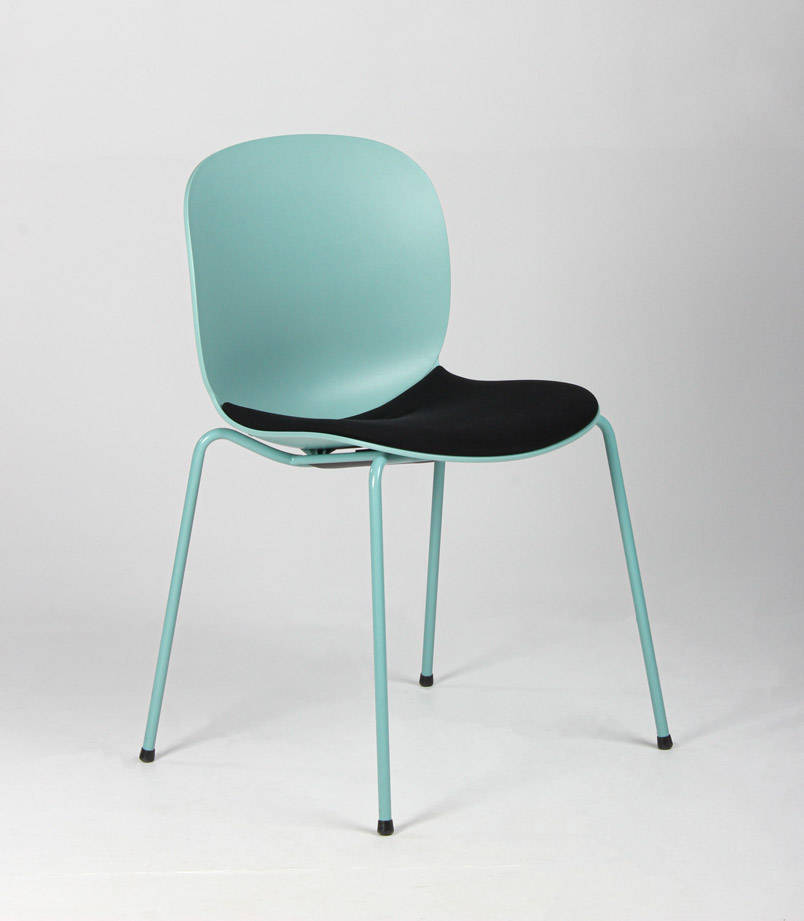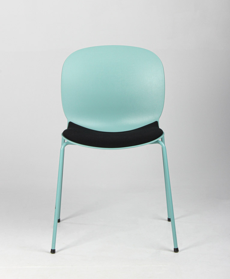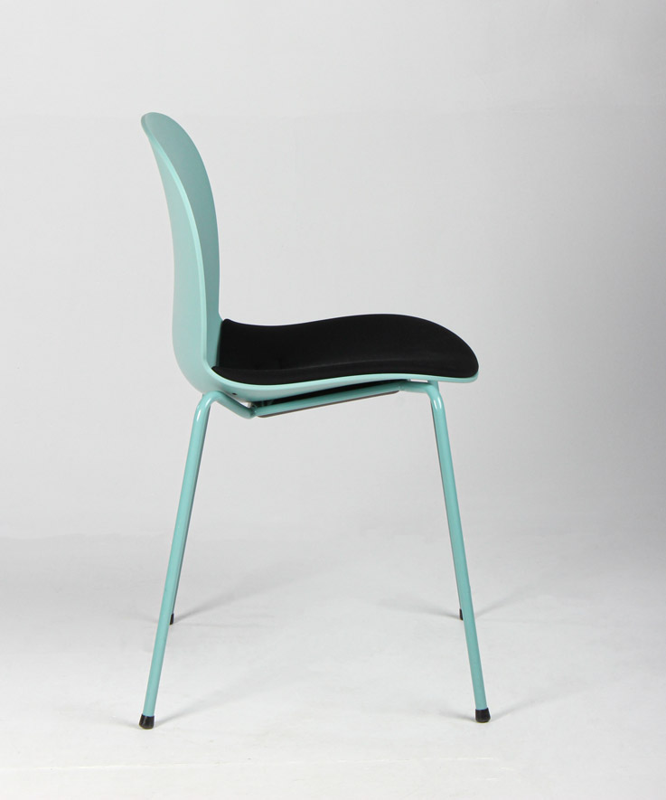 "RBM Noor 6050S stabelbar stol i turkisgrøn polypropylen med sort sædepolstring.