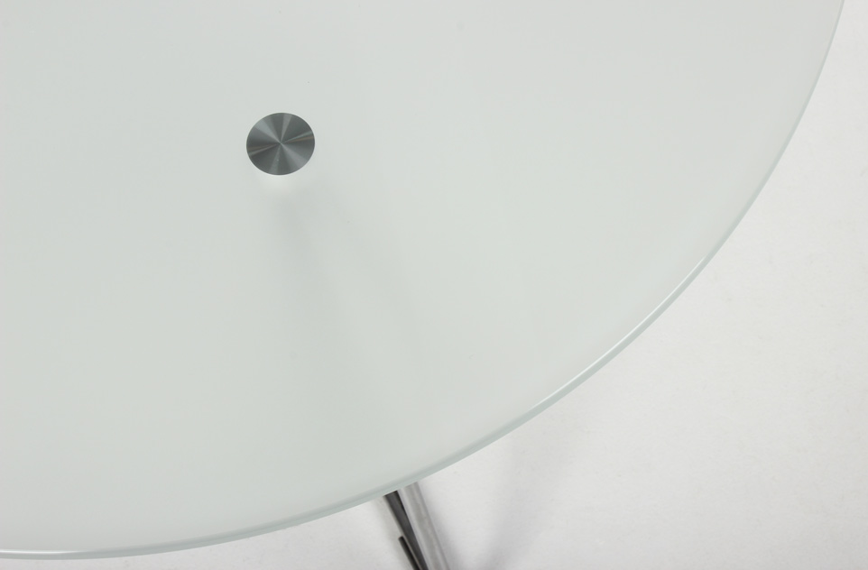 "RBM SV40 loungebord med rund bordplade i frostet glas og blankforkromet stel.