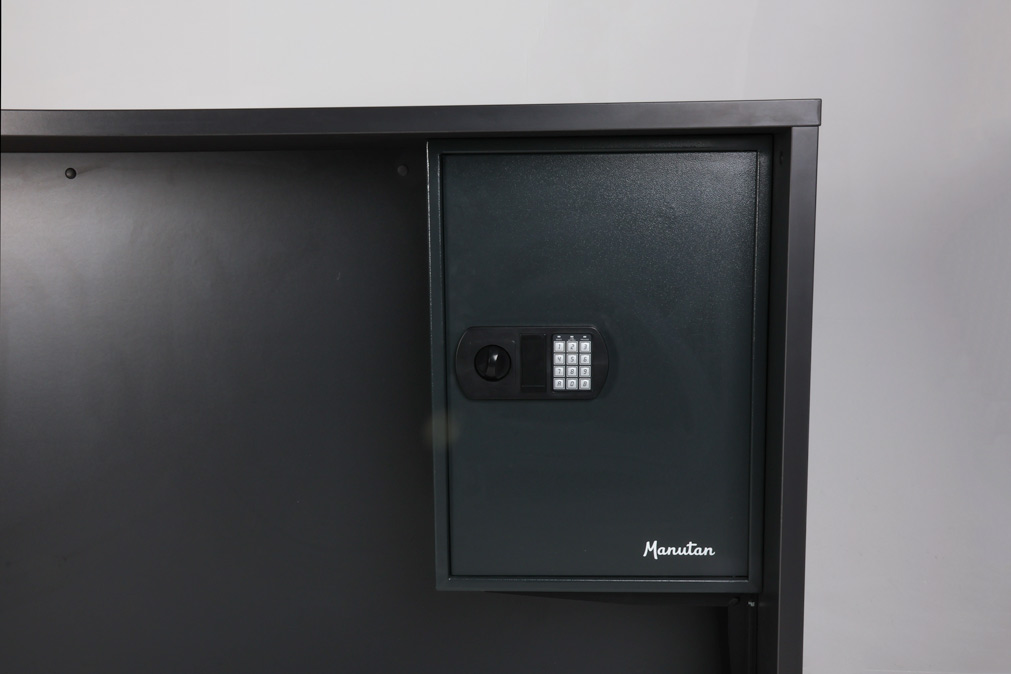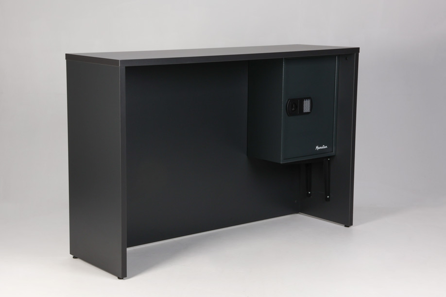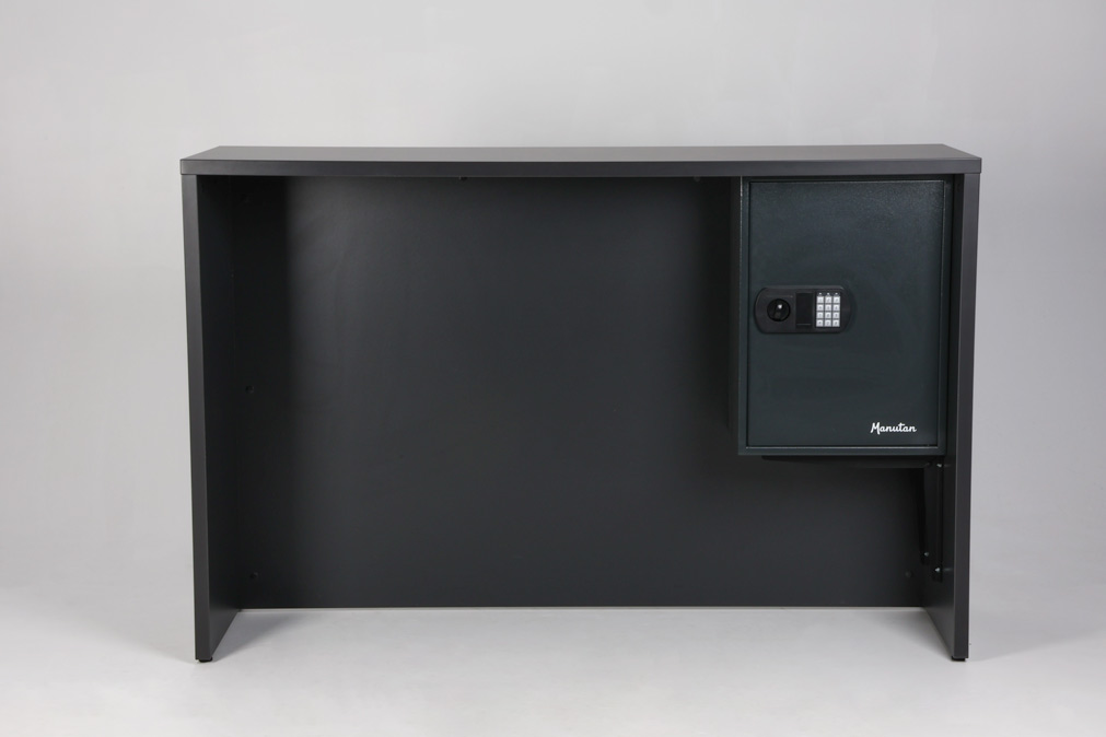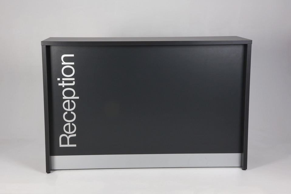 "Receptionsdisk/skranke i antracitgrå laminat med beskyttelsesplade i aluminium, der skåner for mærker og slidtage.