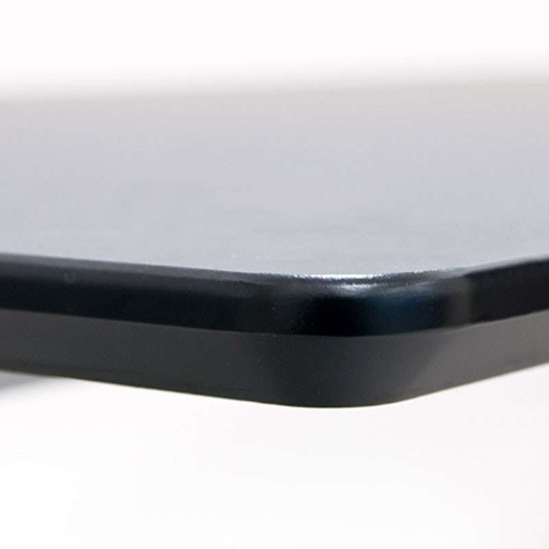 "Rektangulær bordplade i sort linoleum (Nero 4023) med afrundede hjørner (10 mm radius) og en affaset 45 graders kantprofil.
