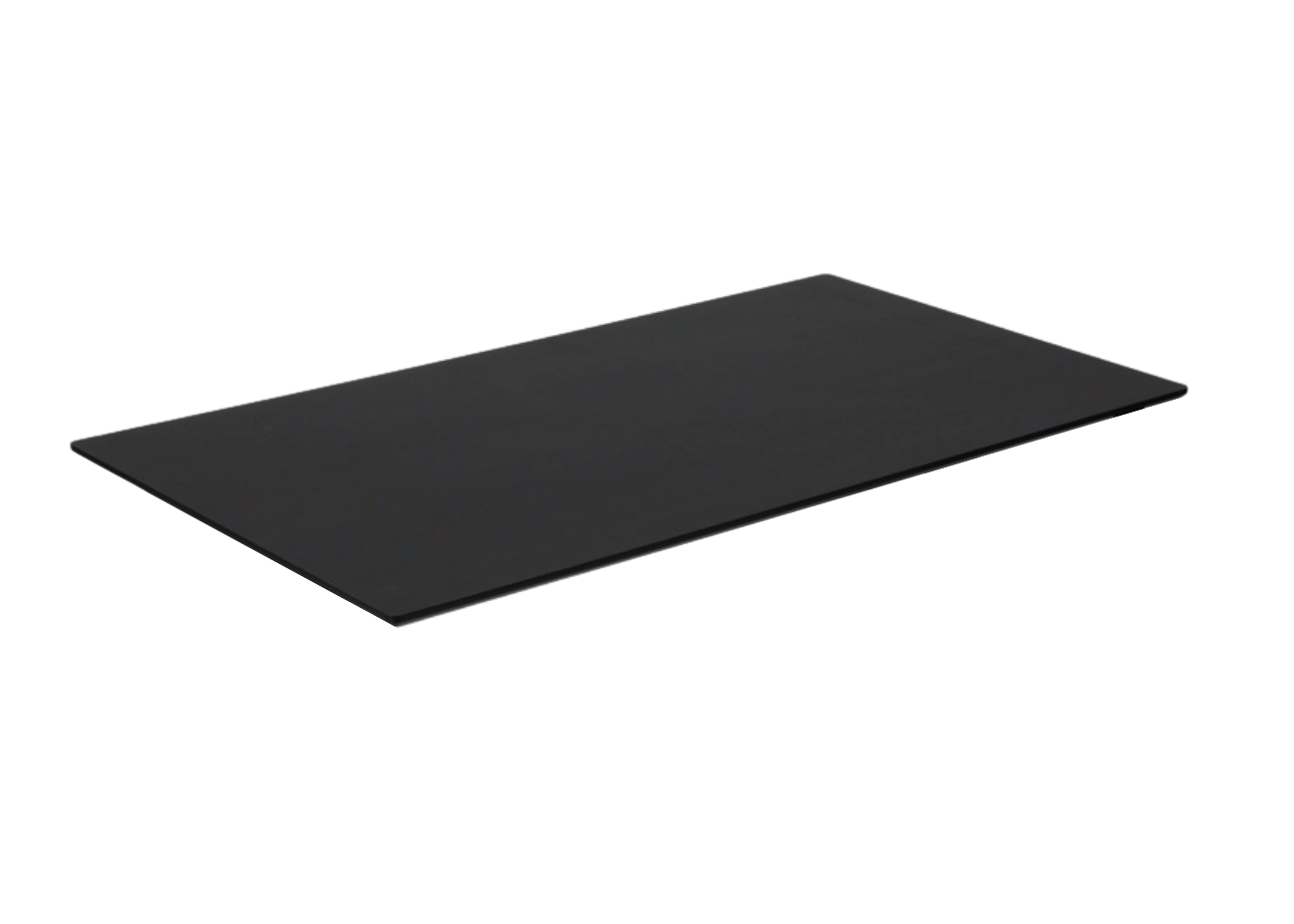 "Rektangulær bordplade i sort linoleum (Nero 4023) med afrundede hjørner (10 mm radius) og en affaset 45 graders kantprofil.