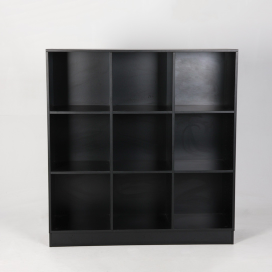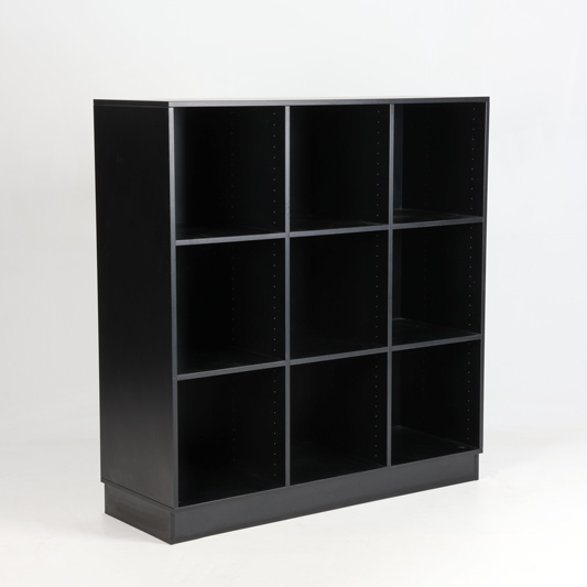 "Stor kontorreol i sort laminat med 9 rum og sokkel med stilleskruer.