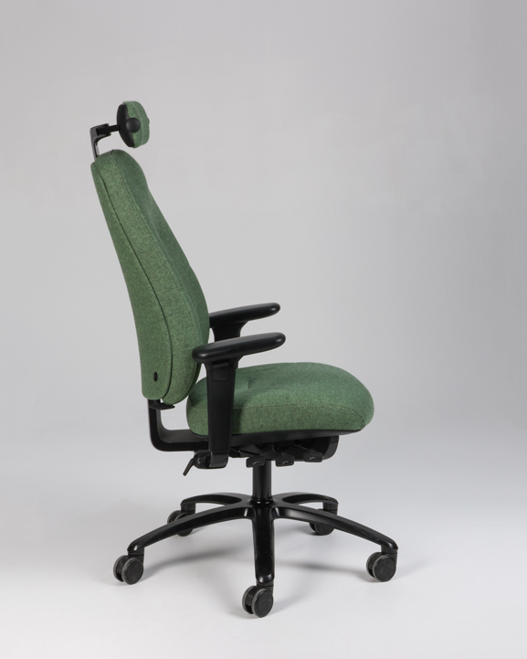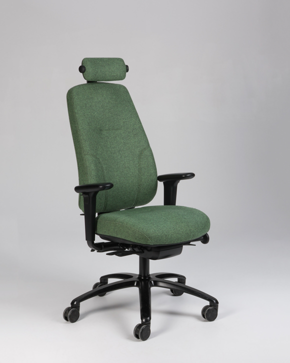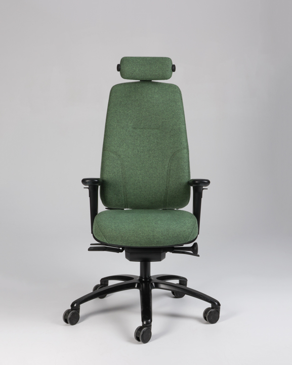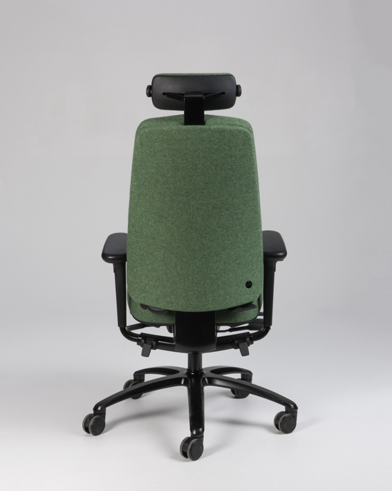 "RH Logic 220 Elite kontorstol med højde- og breddejusterbare armlæn og nakkestøtte i grønmeleret uld samt sort fodkryds. Stolen er udstyret med blandt andet sædevip og højdejusterbart ryglæn, der har til fordel at forbedre den ergonomiske siddestilling og -komfort hele dagen igennem.