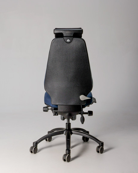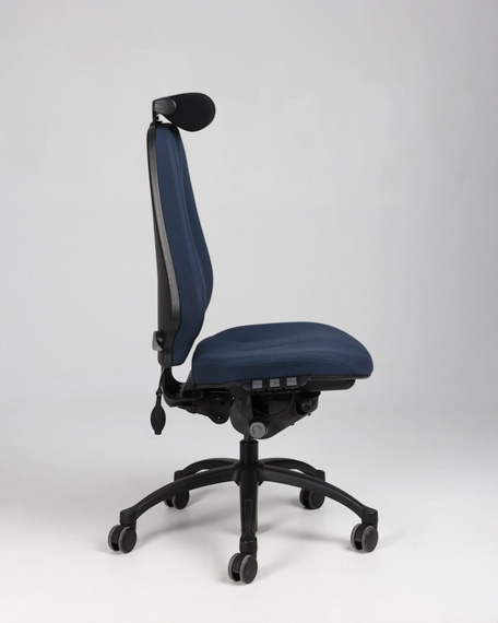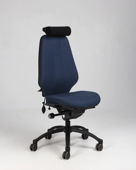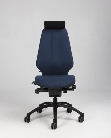 "RH Logic 400 kontorstol betrukket i blå fame. En professionel kontorstol med mange anvendelige funktioner – heriblandt nakkestøtte og pumpebetjent lændestøtte, der gør det nemt at justere, så komforten og den ergonomiske støtte er optimal, hele dagen igennem.