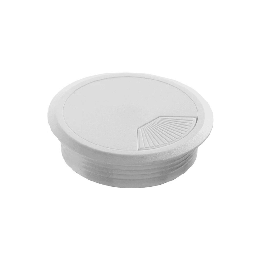 "Hvid Ø80 mm kabelgennemføring i plast, til montering i bordpladen. Med en kabelroset bliver det pænt og praktisk at holde styr på ledninger og kabler, da alle føres ned under bordet på samme sted.