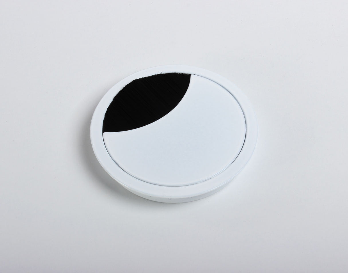 "Roset til montering i bordplade, så kabler kan føres igennem, eksempelvis ned til kabelbakken. Det efterlader et pænt, ordentligt og strømlinet udtryk, da det undgås, at kablerne hænger ned på bagsiden af bordpladen.