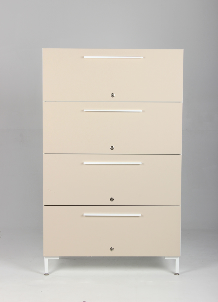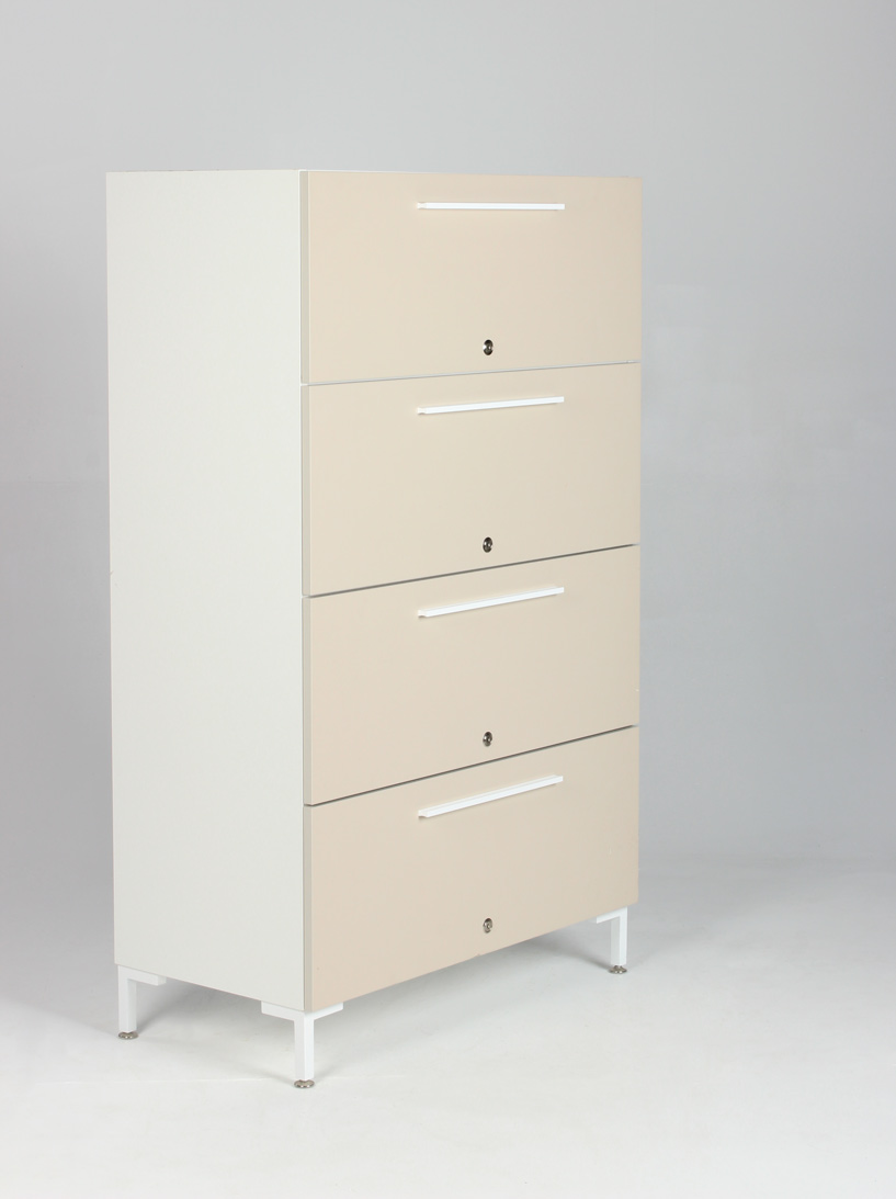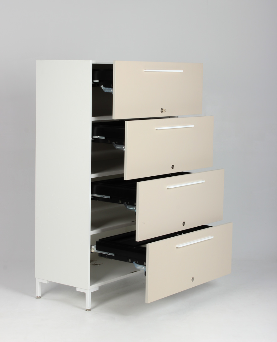 "Rumas arkivskuffer uden bund til opbevaring af hængemapper. Korpus i hvid laminat samt fronter i beige linoleum.