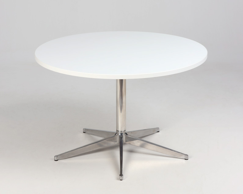 "Rundt loungebord med hvid melaminbordplade med elegant stel i poleret aluminium. Foden på stellet er 5-grenet for en øget stabilitet, og har samtidig diskrete stilleskruer der sikrer et altid fast underlag.