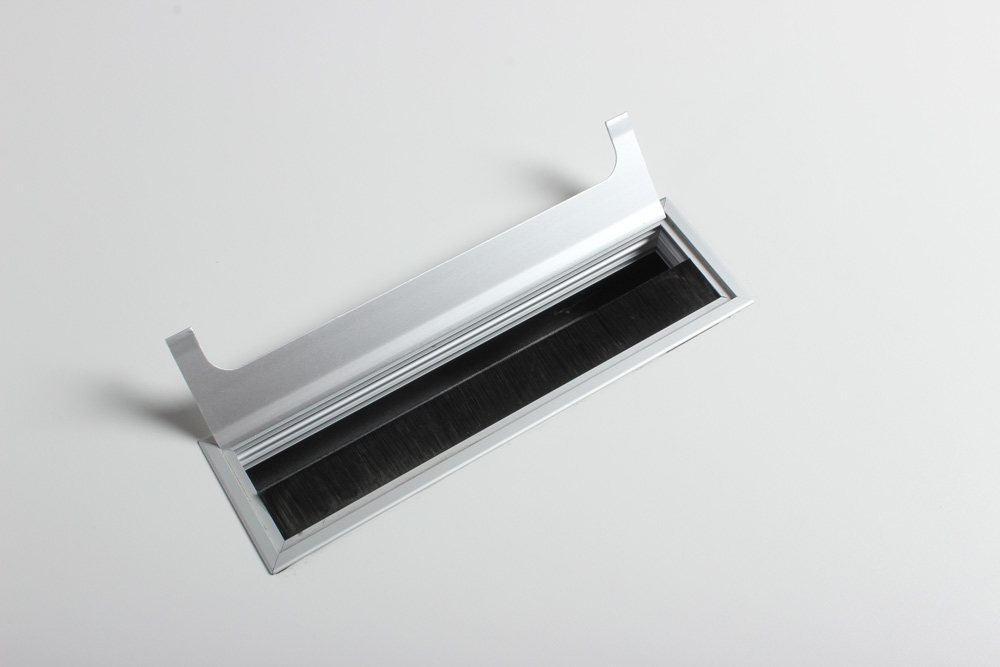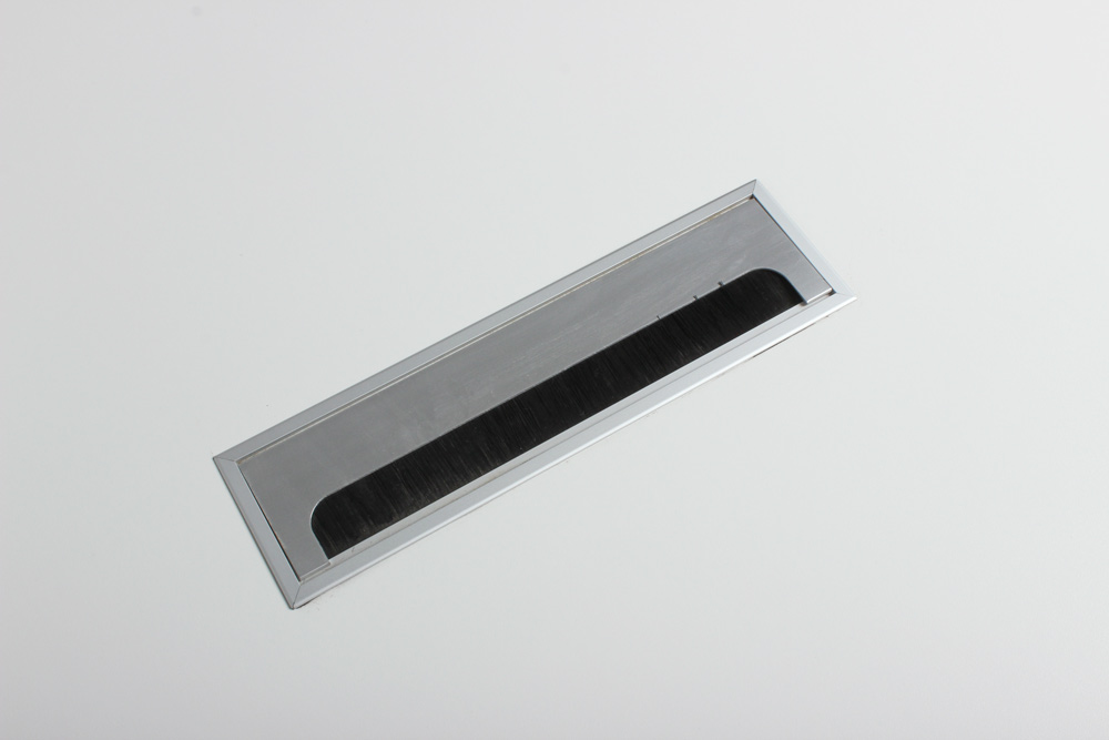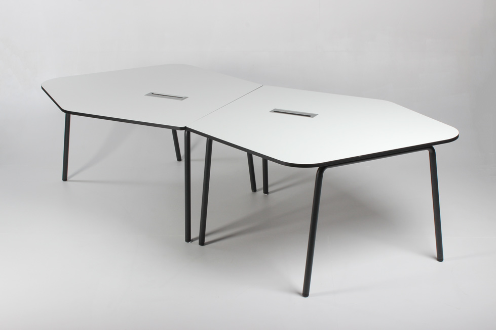 Hvid laminatbordplade med sorte kanter og kabellem til strømforsyning, samt sort stel i pulverlakeret stål.