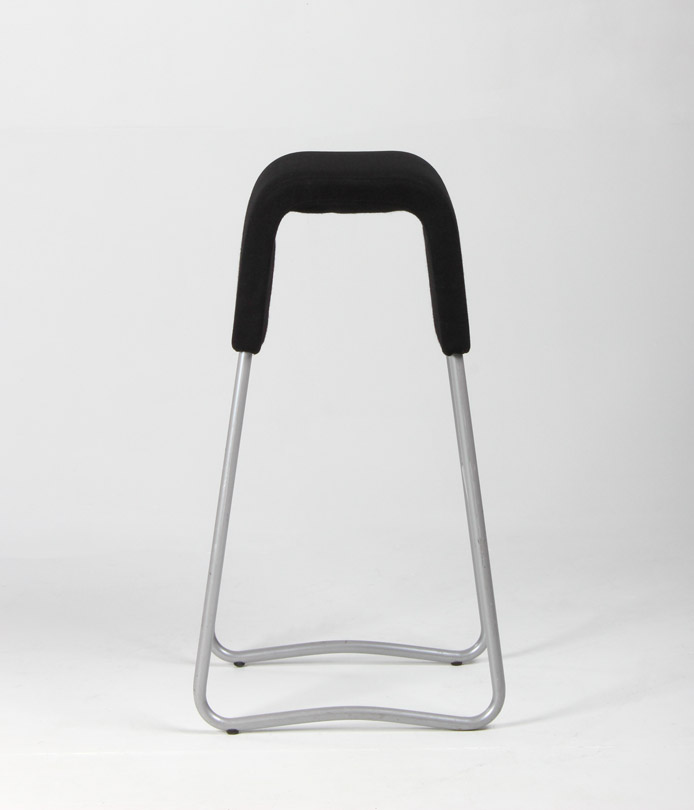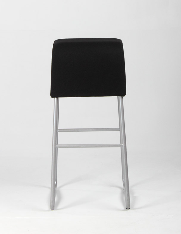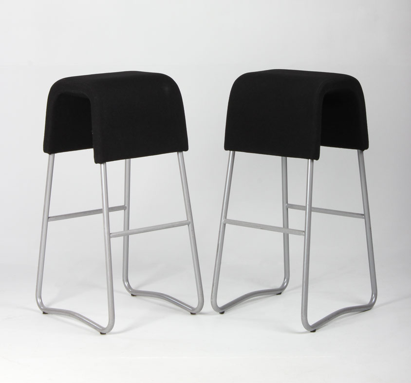 Sæt på 2 stk. Materia Plint barstol polstret og betrukket med sort xtreme, og stel med fodhviler i mat grå stål.