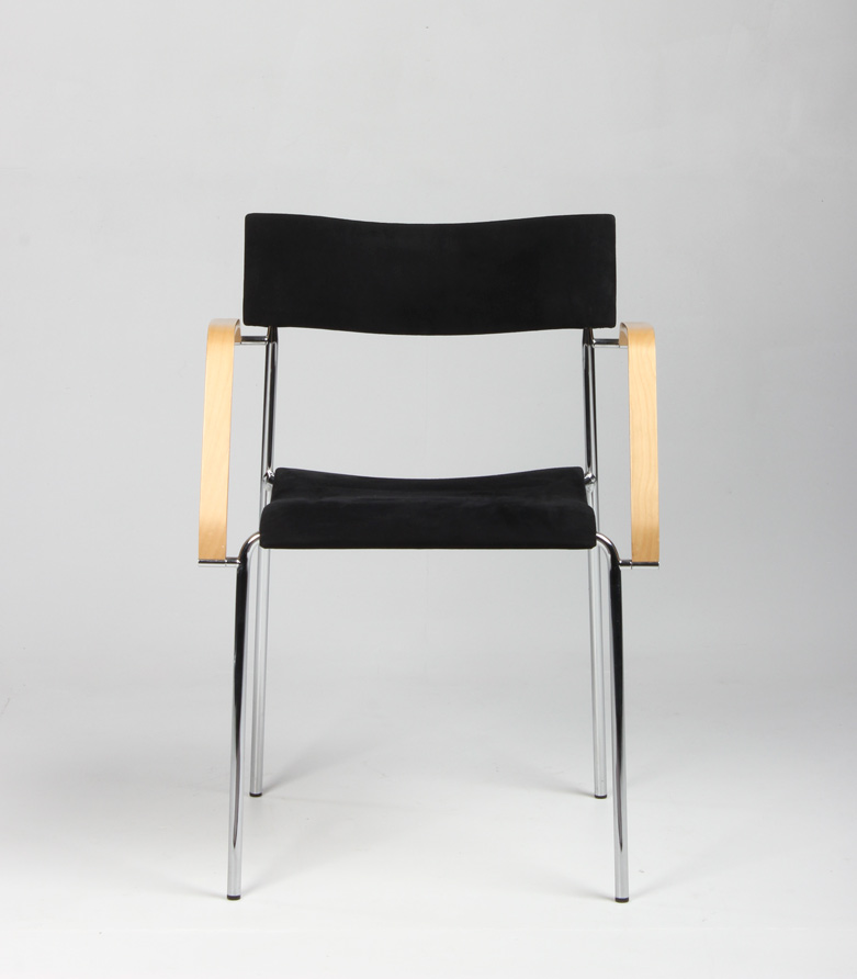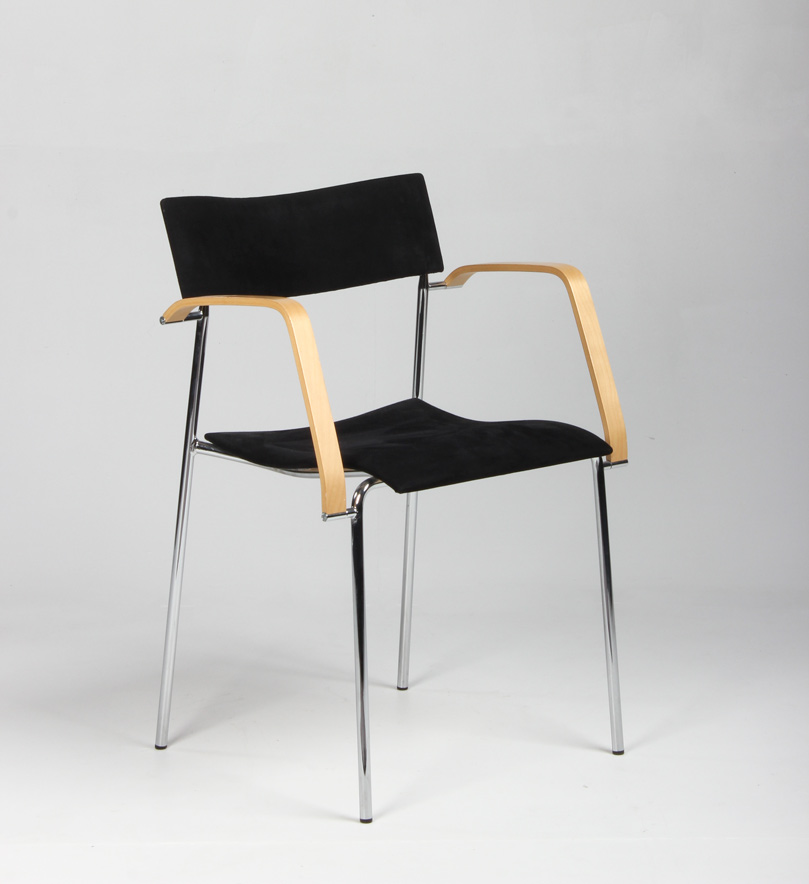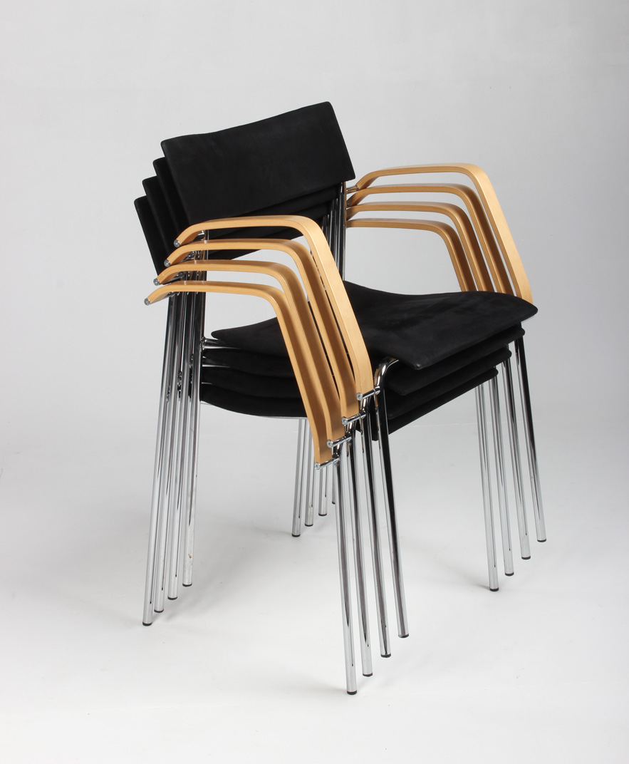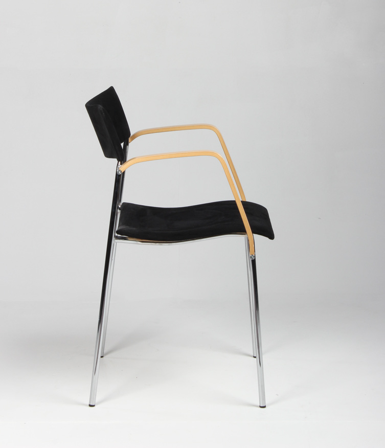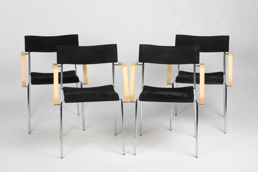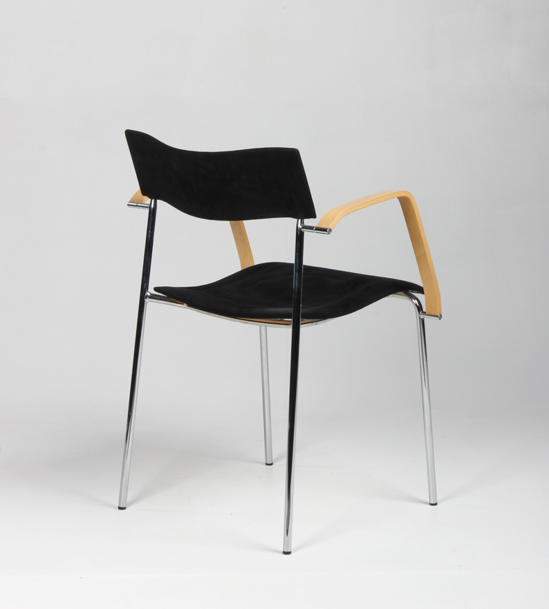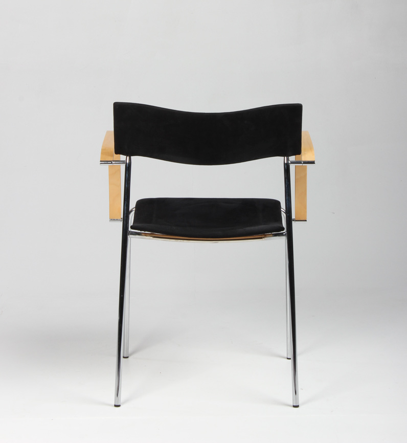 Stolene er polstret i sæde og ryg og betrukket med sort alcantara. Stel i blankforkromet stål og armlæn i lakeret birk.