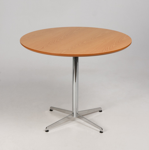 "Savir Design rundt cafébord med egefineret bordplade, affasede kanter og krom sokkel med fire fødder.