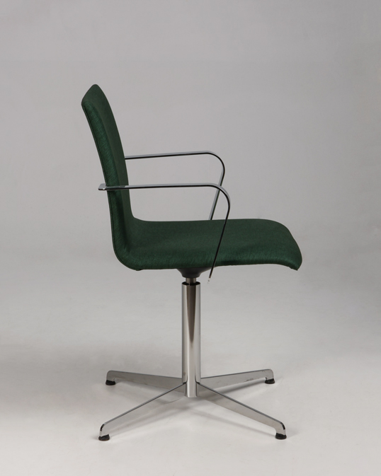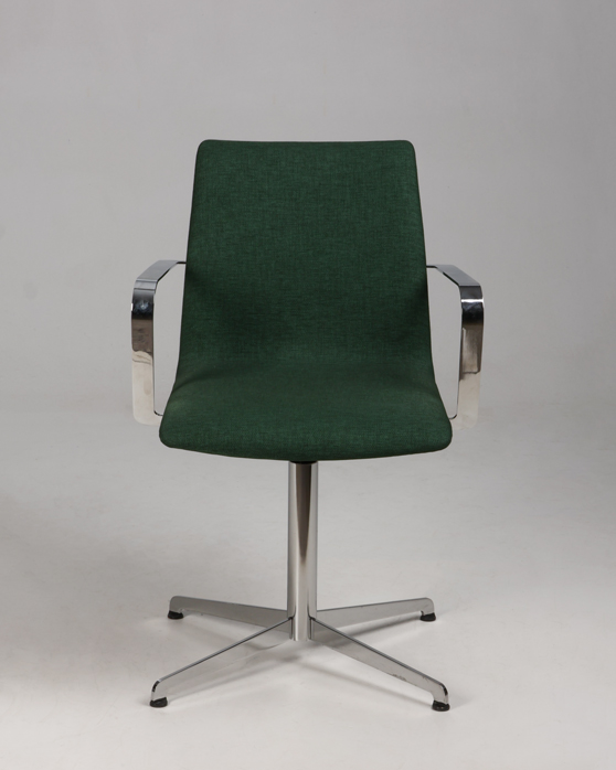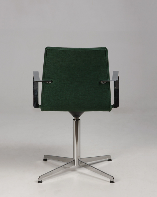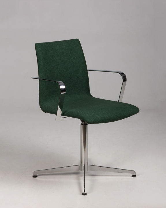 "Savir Design Gate loungestol i meleret grøn remix med blankforkromet stel og armlæn. Stellet har returdrej – en smart funktion der gør, at stolene vender tilbage til ‘neutral’ position og derved giver et ensartet og pænt udtryk når mødelokalet ikke er brug.