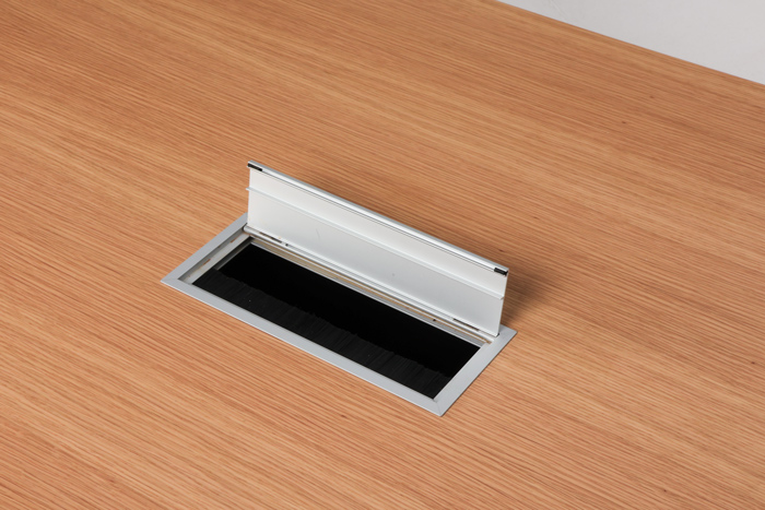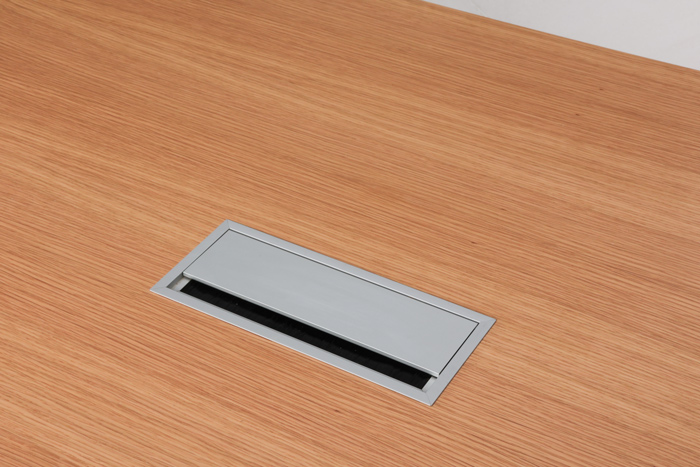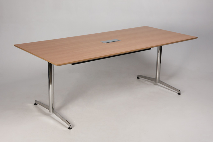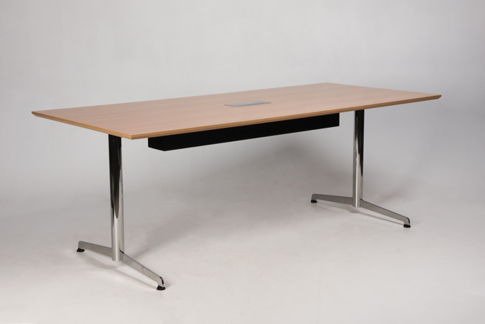 "Savir konferencebord til 6 personer – 3 på hver langside. Bordplade i lakeret egefinér med blankforkromet stel med kabellem og herunder kabelbakke til opbevaring af strømforsyning.