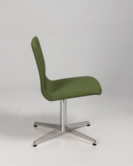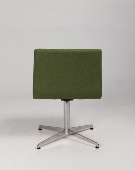 "Savir loungestol i meleret mosgrøn med stel i poleret stål med returdrej – en smart funktion der gør, at stolene går i ‘neutral’ position og derved giver et ensartet og pænt udtryk.