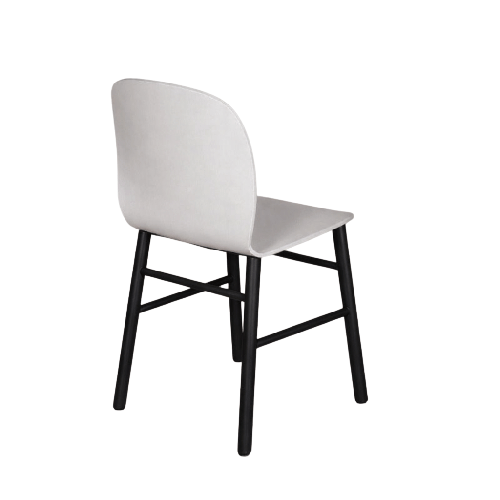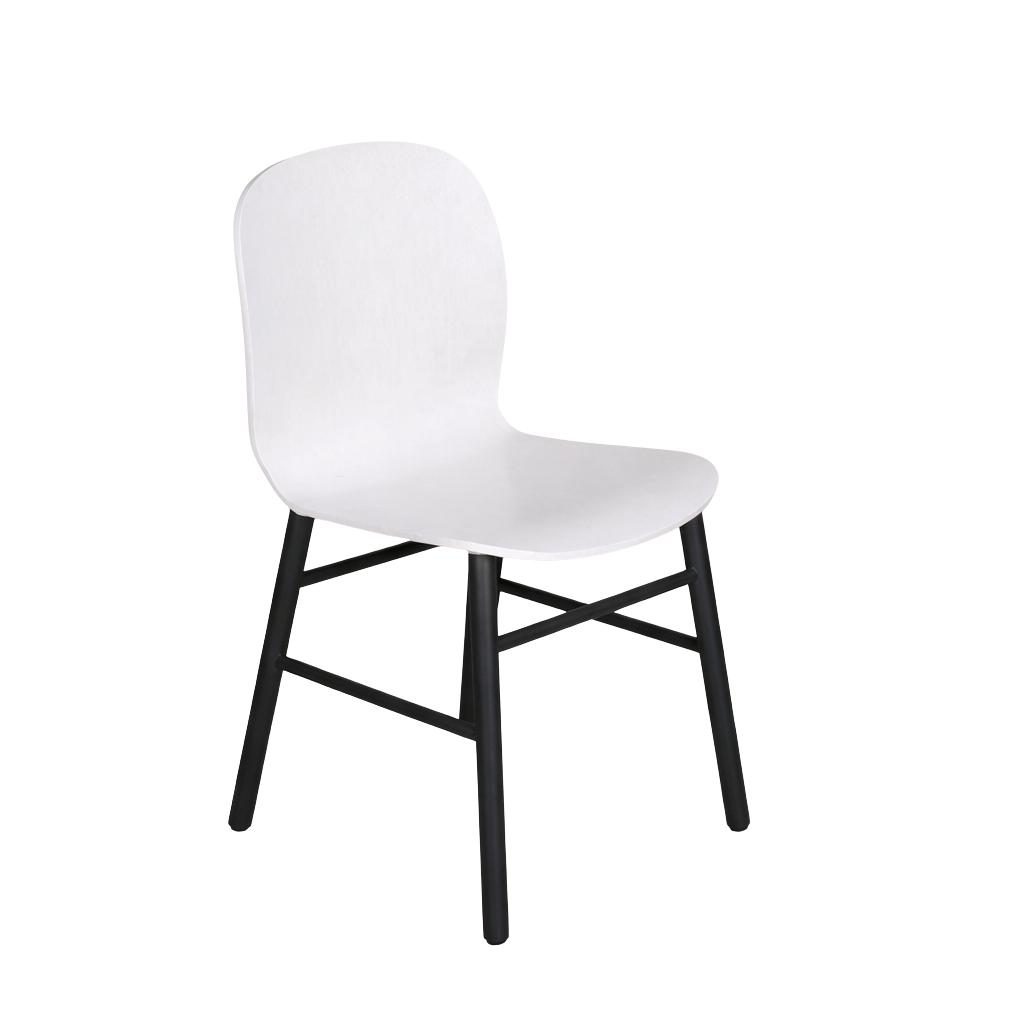 "SixtyOne møde- og spisebordsstol i hvidbejdset formspændt krydsfinér, med synlige åretegninger. Sort stel med metalramme og ben af massiv eg.