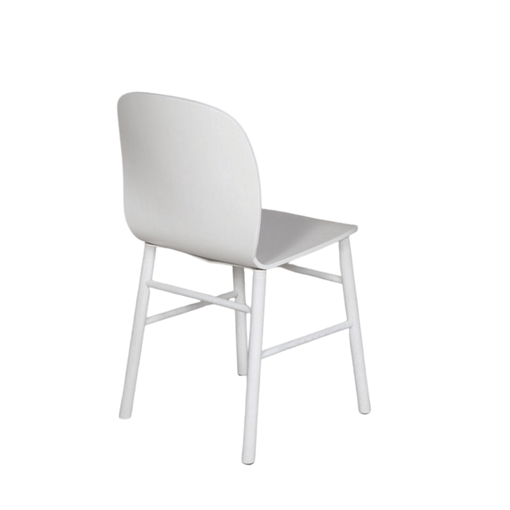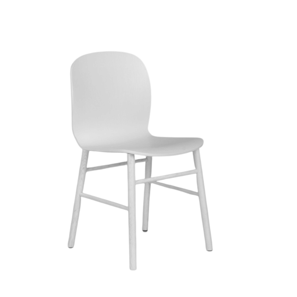 "SixtyOne stol i hvidbejdset formspændt krydsfinér, så træets årer ses. Stel med metalramme og ben af massiv eg. En stol til kantiner, konferencelokaler eller spisestuer, der med sit enkle og nordiske design giver et lyst og let udtryk til rummet.