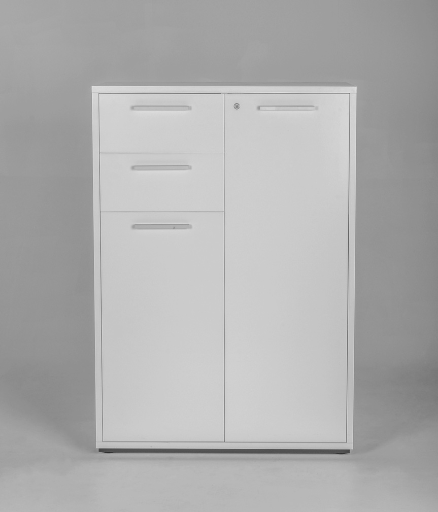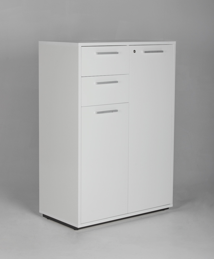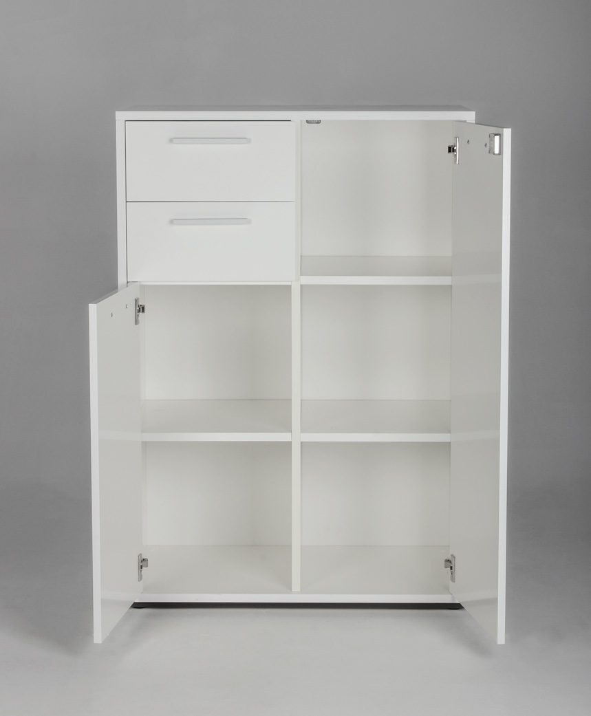 "Skab med to skuffer i hvid højglans laminat med soft close-lukning og mat grå greb. Skabet rummer god opbevaringsplads til blandt andet ringbind og andre kontorartikler, og er et enkelt og tidløst opbevaringsskab, der blender diskret ind i enhver indretning.