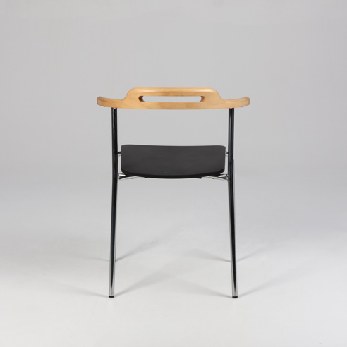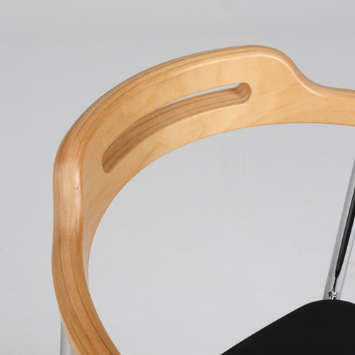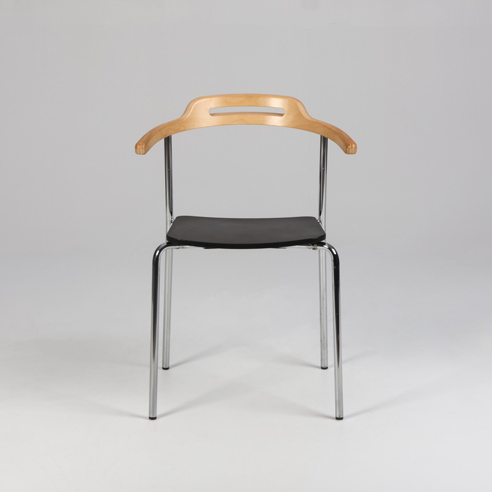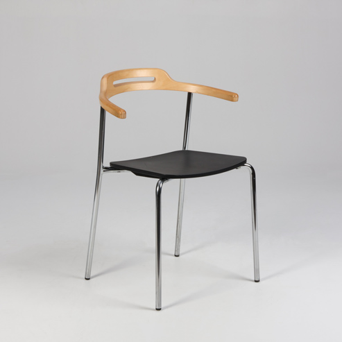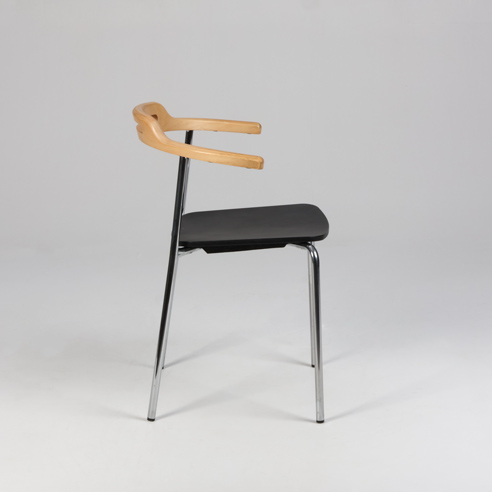 Sæde i sort, rengøringsvenlig PUR-gummi, kombineret ryg- og armlæn i lakeret lys birk og blankforkromet metalstel. Den enkle stol, kan både stables og hænges op på bordkanten i ryglænet, så det er nemt at komme til under bordet i forbindelse med rengøring.