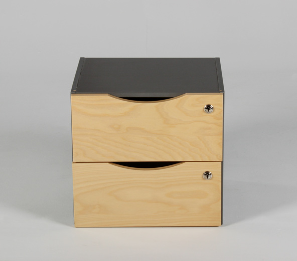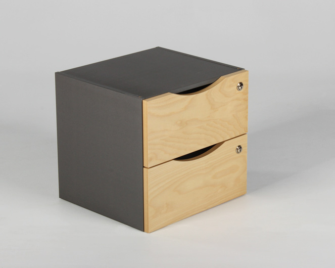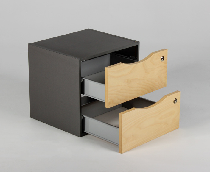 "Skuffeindsats i lys birk og antracitgrå laminat med to skuffer og nøgle.