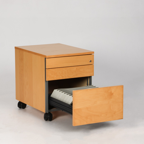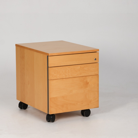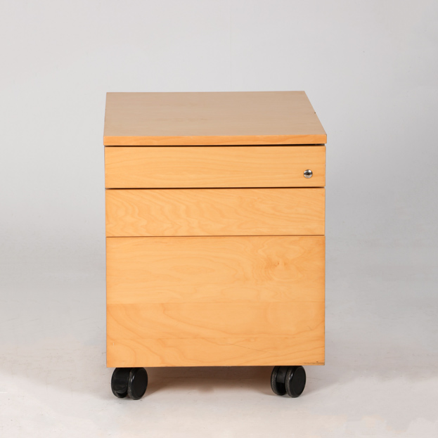 "Skuffeboks på hjul i lys birk med tre push-to-open skuffer, hvoraf øverste har pennebakke.