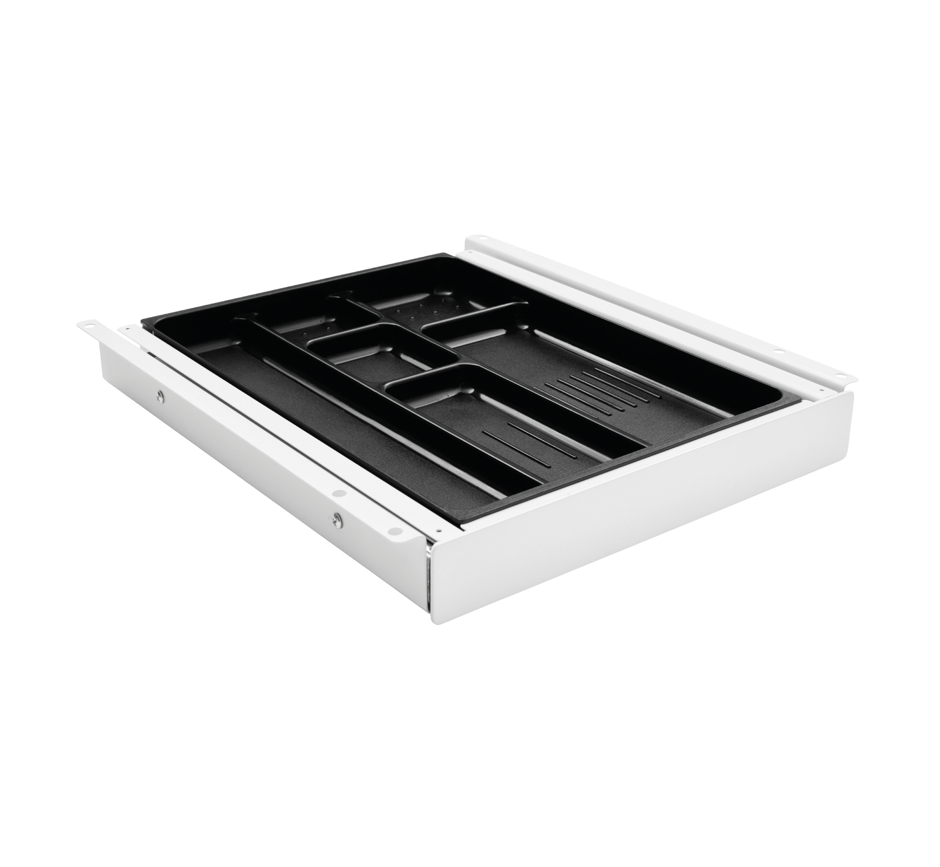 "Smal udtræksskuffe i hvid metal til montering under hæve-/sænke- eller skrivebordet.