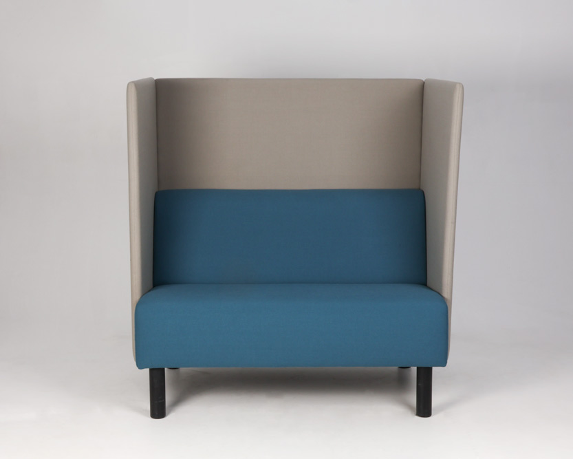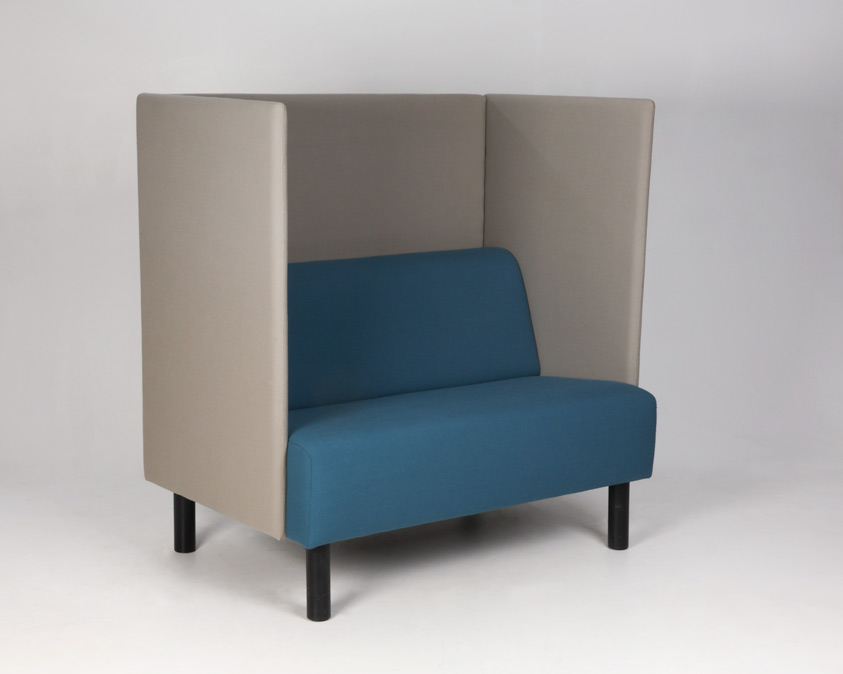 "Akustiksofa i gråbeige og turkis, med vægge fremstillet i et effektivt lyd- og støjreducerende materiale. Sofaen er perfekt eksempelvis til loungeområdet, i institutioner eller det åbne kontormiljø, hvor der er behov for diskrete samtaler eller telefonopkald uden omgivelserne forstyrres.