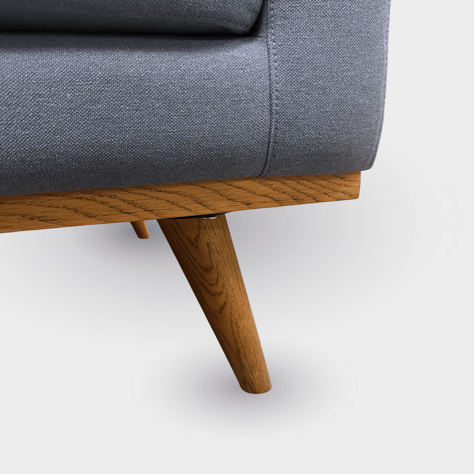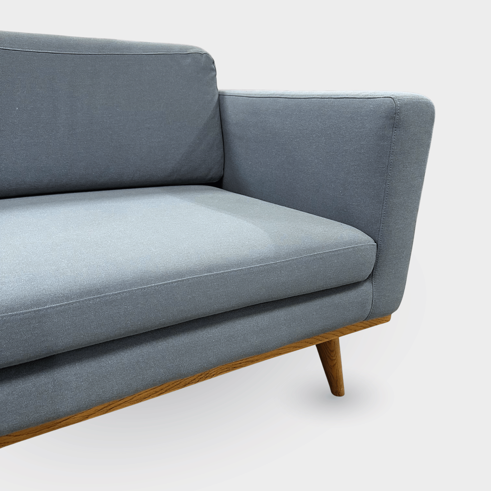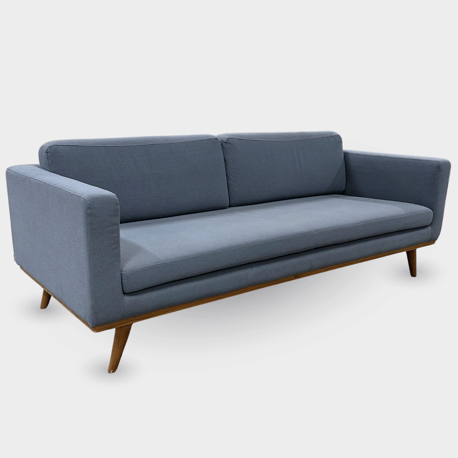 "Stilren og indbydende 3-personers sofa i en flot lys støvet blå med skrå koniske mørke egetræsben.