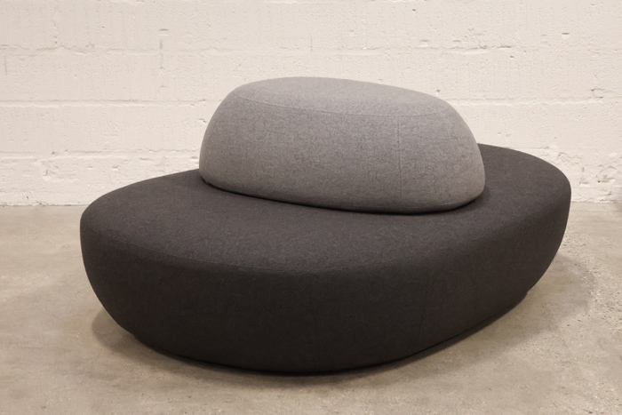 "Softline Sisters puf-loungesofa i grå nuancer. Det store møbel er udformet, så de to pufs kan adskilles hvilket giver mulighed for enten at bruge dem separate og adskilte i hver sin størrelse, eller opstille dem så den mindste fungerer som ryglæn. I 2017 modtog sættet den prestigefyldte Good Design Award.