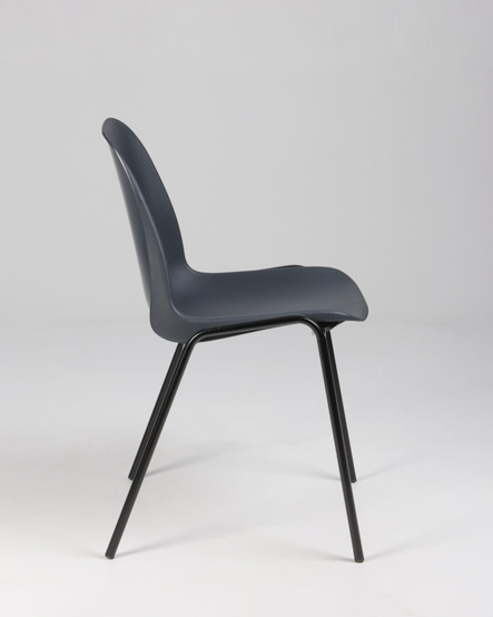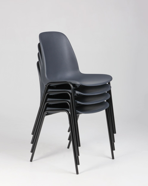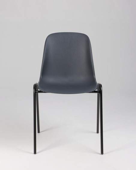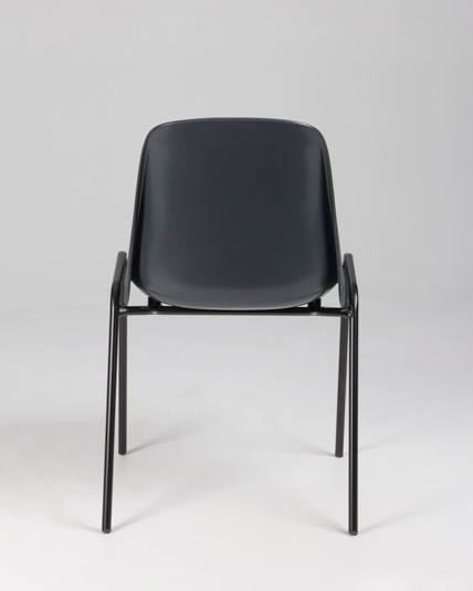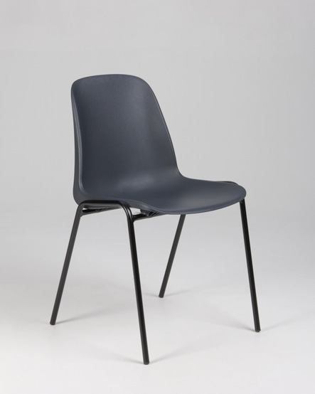 "Stabelstol i formstøbt antracitgrå plast med sort stel. Praktisk og let stol i slidstærkt materiale, til arbejdspladsens frokoststue, kantine eller som ekstrastole.