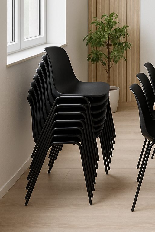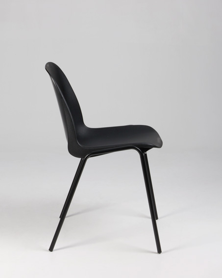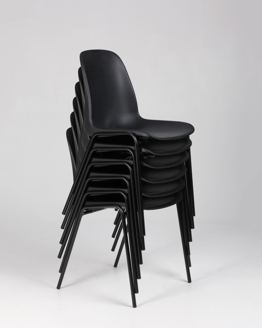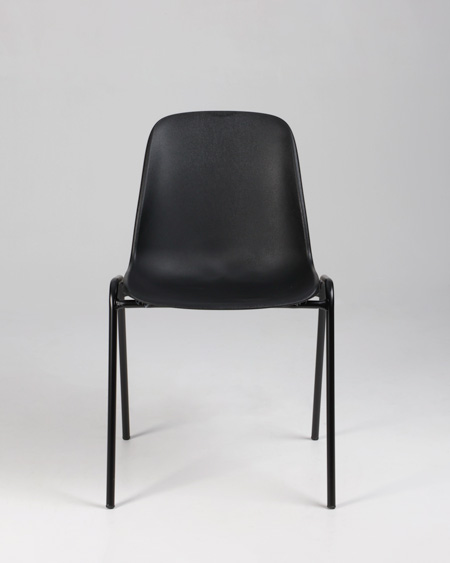 "Stabelstol i formstøbt sort plast med sort stel. Praktisk og let stol i slidstærkt materiale, til arbejdspladsens frokoststue, kantine eller som ekstrastole.