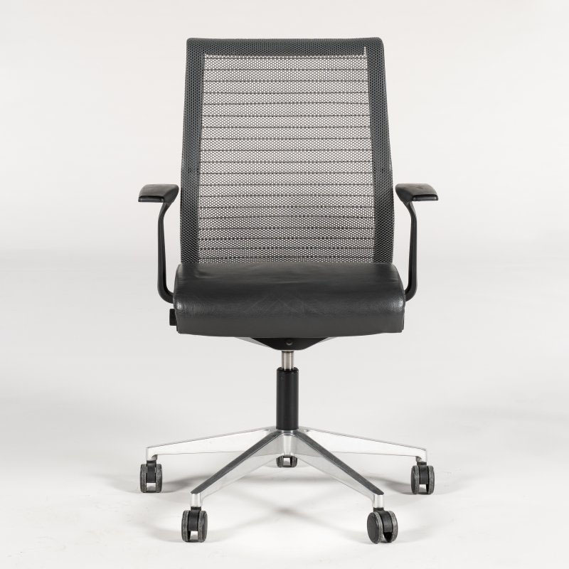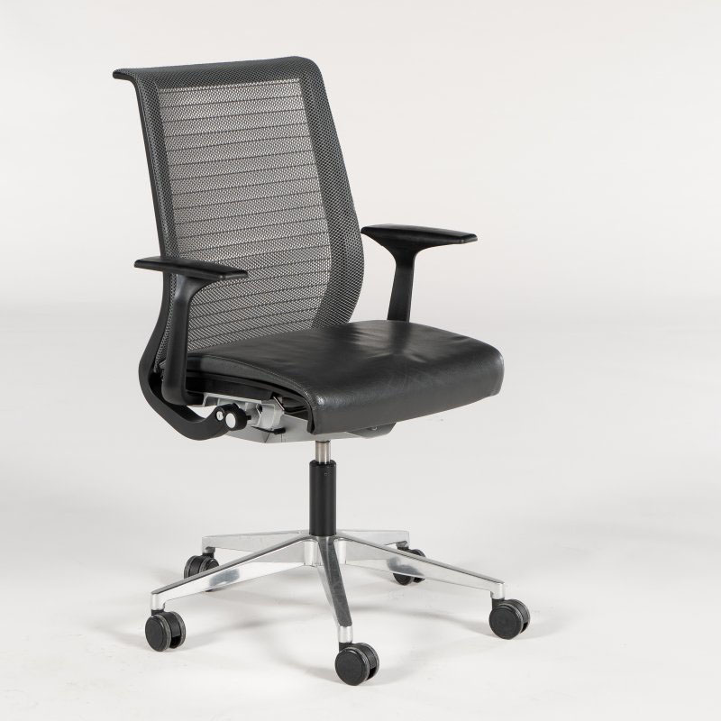 "Steelcase Think Task konferencestol med mørkegråt lædersæde og ryg mesh. Stolen har armlæn og sædedybderegulering, der kan tilpasses den enkelte brugers siddestilling og -komfort. Drejestel med returdrej – en smart funktion der gør, at stolene går i ‘neutral’ position og derved giver et ensartet og pænt udtryk når de ikke er i brug.