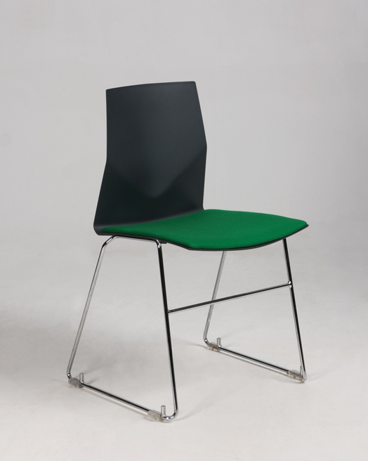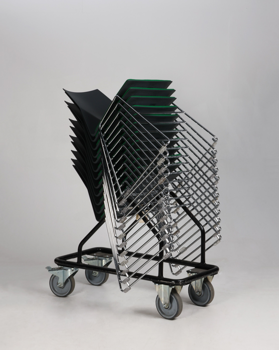 "11 stk. Four Design kantinestole i antracitgrå plast med grøn sædepolstring i fame og krom medestel. Med stolene medfølger en praktisk vogn, hvorpå stolene kan stables og derved gør det nemt at transportere uden at skulle belaste ryggen.