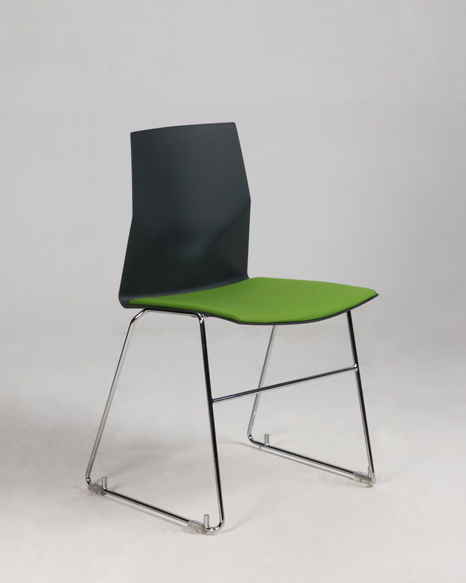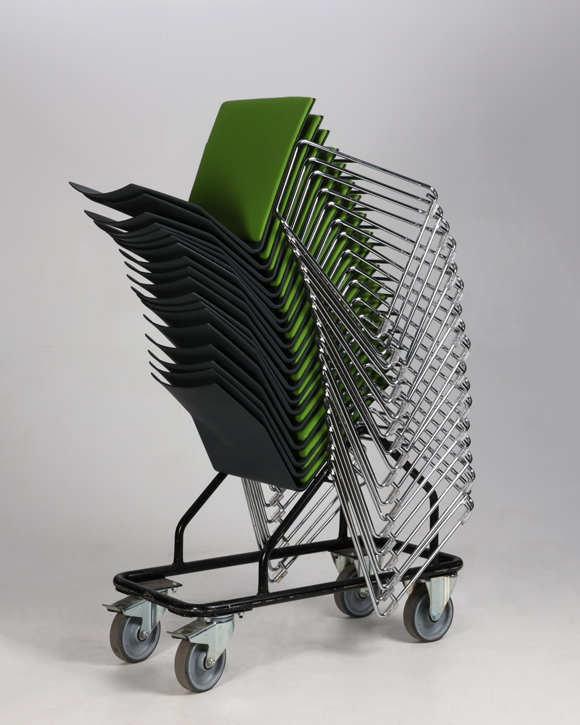 "18 stk. Four Design kantinestole i antracitgrå plast med limegrøn sædepolstring i fame og krom medestel. Med stolene medfølger en praktisk vogn, hvorpå stolene kan stables og derved gør det nemt at transportere uden at skulle belaste ryggen.