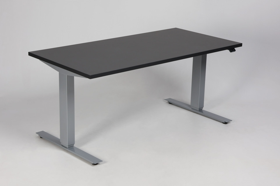 "Swedstyle hæve sænkebord på 140 cm i antracitgrå med gråt stel. Bordets stel er udstyret med to motorer og tre led der justerer højden fra 63-129 cm.