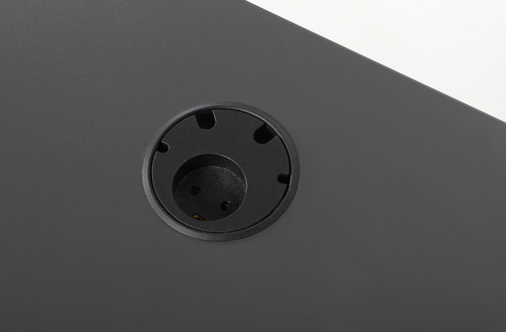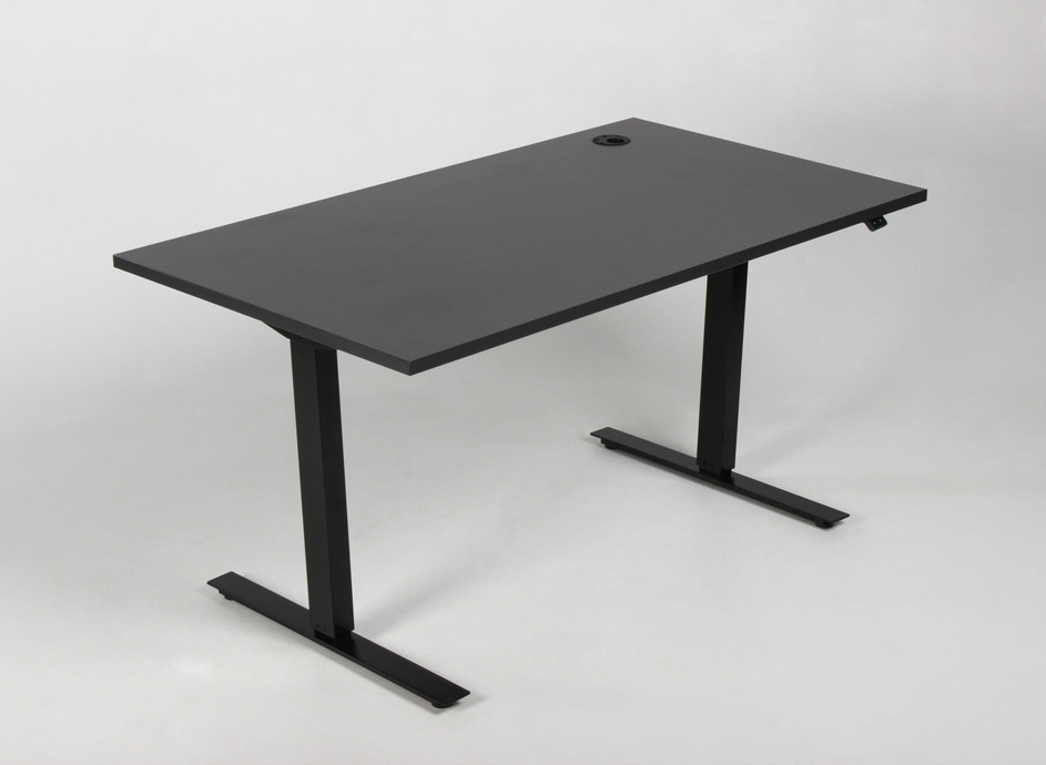 "Swedstyle elektrisk hæve-sænkebord med antracitgrå laminatbordplade med strømstik i højre hjørne af bordpladen. Det sorte stel har én motor og to led, der giver mulighed for at justere højden. Under bordpladen er monteret en praktisk kabelbakke, der samler og holder styr på ledninger.