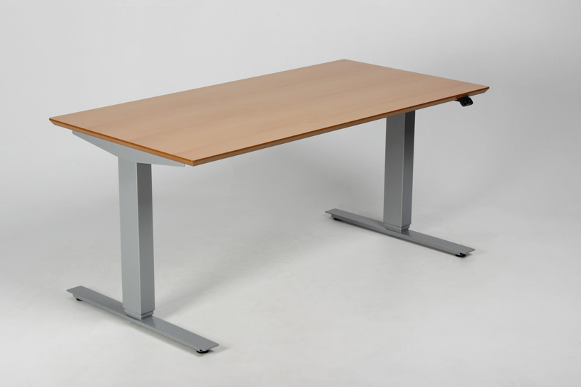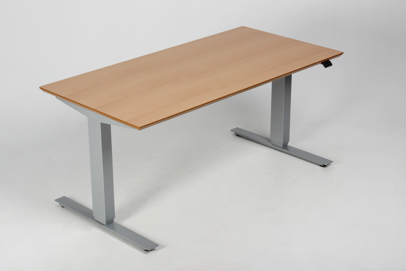"Swedstyle hæve sænkebord i lakeret bøgefinér og gråt stel. Det mindre kvalitets-skrivebord har en motor i hvert ben og kan justeres helt op til 129 cm i højden. Med stilleskruerne under fødderne, står bordet altid fast så man er sikret et fast arbejdsunderlag.