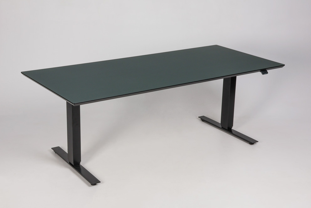 "Swedstyle elektrisk hæve sænkebord med Dencon linoleumsbordplade i en flaskegrøn (Connifer) nuance. 3-leddet sort stel med 2 motorer, som giver mulighed for at justere arbejdshøjden efter behov.