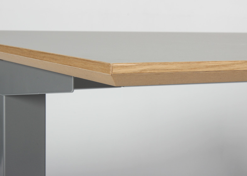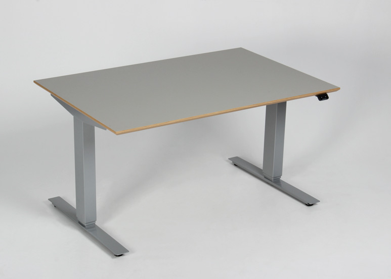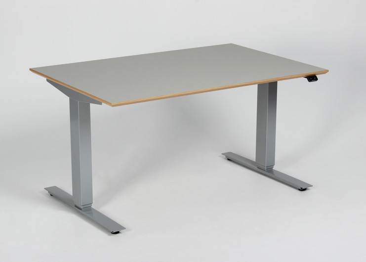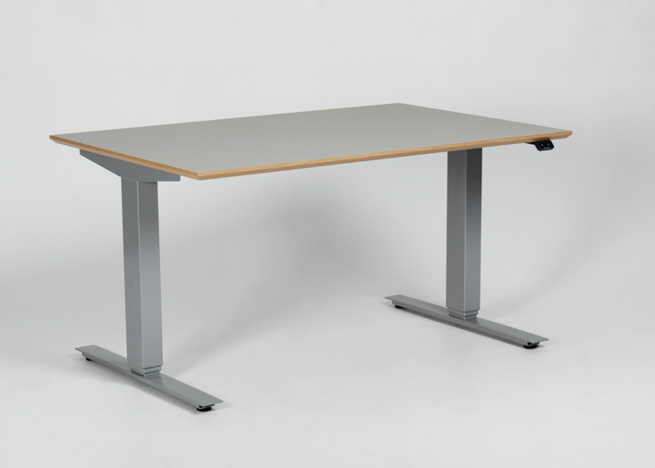 "Mindre upcyclet hæve sænkebord med nyt stel fra Swedstyle og brugt linoleumsbordplade med egefineret kant. Bordet kan justeres i højden 60-123 cm. For et flot og funktionelt finish, se vores udvalg af tilbehør i form af bl.a. kabelrosetter, computerholdere og udtræksskuffer – vi monterer det GRATIS!